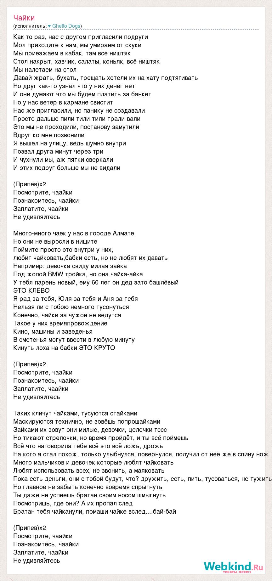 Как то раз, нас с другом пригласили подруги Мол приходите к нам, мы умираем от скуки Мы приезжаем в кабак, там всё ништяк Стол накрыт, хавчик, салаты, коньяк, всё ништяк Мы налетаем на стол Давай жрать, бухать, трещать хотели их на хату подтягивать Но друг как-то узнал что у них денег нет И они думают что мы будем платить за банкет Но у нас ветер в кармане свистит Нас же пригласили, но панику не создавали Просто дальше пили тили-тили трали-вали Это мы не проходили, постанову замутили Вдруг ко мне позвонили Я вышел на улицу, ведь шумно внутри Позвал друга минут через три И чухнули мы, аж пятки сверкали И этих подруг больше мы не видали (Припев)х2 Посмотрите, чаайки Познакомтесь, чаайки Заплатите, чаайки Не удивляйтесь Много-много чаек у нас в городе Алмате Но они не выросли в нищите Поймите просто это внутри у них, любит чайковать,бабки есть, но не любят их давать Например: девочка свиду милая зайка Под жопой BMW тройка, но она чайка-айка У тебя парень новый, ему 60 лет он дед зато башлёвый ЭТО КЛЁВО Я рад за тебя, Юля за тебя и Аня за тебя Нельзя ли с тобою немного тусонуться Конечно, чайки за чужое не ведутся Такое у них времяпровождение Кино, машины и заведенья В сметенья могут ввести в любую минуту Кинуть лоха на бабки ЭТО КРУТО (Припев)х2 Посмотрите, чаайки Познакомтесь, чаайки Заплатите, чаайки Не удивляйтесь Таких кличут чайками, тусуются стайками Маскируются технично, не зовёшь попрошайками Зайками их зовут они милые, девочки, целочки тссс Но тикают стрелочки, но время пройдёт, и ты всё поймешь Всё что наговорила тебе всё это всё ложь, дрожь На кого я стал похож, только улыбнулся, повернулся, получил от неё же в спину нож Много мальчиков и девочек которые любят чайковать Любят использовать всех, не звонить, а маяковать Пока есть деньги, они с тобой будут, что? дружить, есть, пить, тусоваться, не тужить Но главное не забыть конечно вовремя спрыгнуть Ты даже не успеешь братан своим носом шмыгнуть Посмотришь, где они? А их пропал след Братан тебя чайканули, помаши чайке вслед....бай-бай (Припев)х2 Посмотрите, чаайки Познакомтесь, чаайки Заплатите, чаайки Не удивляйтесь