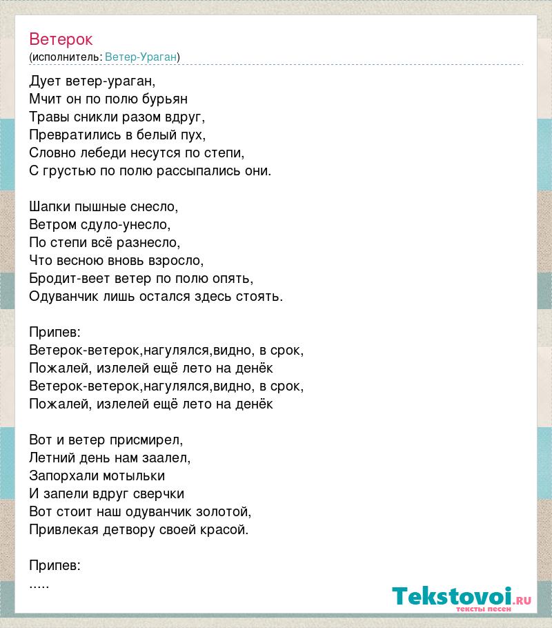 Дует ветер-ураган, Мчит он по полю бурьян Травы сникли разом вдруг, Превратились в белый пух, Словно лебеди несутся по степи, С грустью по полю рассыпались они. Шапки пышные снесло, Ветром сдуло-унесло, По степи всё разнесло, Что весною вновь взросло, Бродит-веет ветер по полю опять, Одуванчик лишь остался здесь стоять. Припев: Ветерок-ветерок,нагулялся,видно, в срок, Пожалей, излелей ещё лето на денёк Ветерок-ветерок,нагулялся,видно, в срок, Пожалей, излелей ещё лето на денёк Вот и ветер присмирел, Летний день нам заалел, Запорхали мотыльки И запели вдруг сверчки Вот стоит наш одуванчик золотой, Привлекая детвору своей красой. Припев: .....