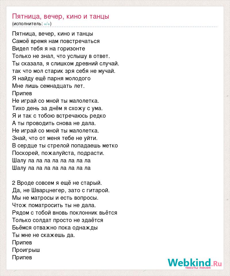 Пятница, вечер, кино и танцы Самоё время нам повстречаться Видел тебя я на горизонте Только не знал, что услышу в ответ. Ты сказала, я слишком древний случай. так что мол старик зря себя не мучай. Я найду ещё парня молодого Мне лишь семнадцать лет. Припев Не играй со мной ты малолетка. Тихо день за днём я схожу с ума. Я и так с тобою встречаюсь редко А ты проводить снова не дала. Не играй со мной ты малолетка. Знай, что от меня тебе не уйти. В сердце ты стрелой попадаешь метко Поскорей, пожалуйста, подрасти. Шалу ла ла ла ла ла ла ла ла Шалу ла ла ла ла ла ла ла ла 2 Вроде совсем я ещё не старый. Да, не Шварцнегер, зато с гитарой. Мы не матросы и есть вопросы. Чтож поматросить ты не дала. Рядом с тобой вновь поклонник вьётся Только солдат просто не здаётся Бьёмся отважно пока однажды Ты мне не скажешь да. Припев Проигрыш Припев