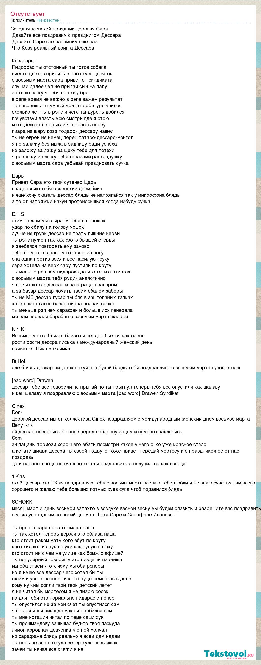 Сегодня женский праздник дорогая Сара Давайте все поздравим с праздником Дессара Давайте Саре все напомним еще раз Что Козз реальный воин а Дессара Коззпорно Пидороас ты отстойный ты готов собака вместо цветов принять в очко хуев десяток с восьмым марта сара привет от синдиката слушай далее чел не прыгай сын на папу за твою лажу я тебя порежу брат в рэпе время не важно в рэпе важен результат ты говоришь ты умный мол ты арбитуре учился сколько лет ты в рэпе и чего ты дурень добился почувствуй власть мою смотри где я стою мать дессар не прыгай я те пасть порву пиара на шару козз подарок дессару нашел ты не еврей не немец перец татаро-дессаро-монгол я не залажу без мыла в задницу ради успеха но заложу за лажу за щеку тебе для потехи я разложу и сложу тебя фразами раскладушку с восьмым марта сара уебывай праздновать сучка Царь Привет Сара это твой сутенер Царь поздравляю тебя с женский днем биич и еще хочу сказать дессар блядь не напрягайся так у микрофона блядь а то от напряжки нахуй пропоносишься когда нибудь сучка D.1.S этим треком мы стираем тебя в порошок удар по ебалу на голову мешок лучше не грузи дессар не трать лишние нервы ты рэпу нужен так как фото бывшей стервы я заебался повторять ему заново тебе не место в рэпе мать твою за ногу она одна против всех и все насилуют суку сара хотела на верх сару пустили по кругу ты меньше рэп чем пидарокс да и кстати а птичках с восьмым марта тебя рудик аналогично я не читаю как дессар и на страдаю запором а за базар дессар ломать твоим ебалом заборы ты не МС дессар гусар ты бля в заштопаных тапках хотел пиар гавно базар пиара полная срака ты меньше рэп чем сарафан и больше лох генерала мы вам порвали барабан с восьмым марта шалавы N.1.K. Восьмое марта близко близко и сердце бьется как олень рости рости дессра писька в международный женский день привет от Ника максимка BuHoi алё блядь дессар пидарок нахуй это бухой блядь тебя поздравляет с восьмым марта сучонок наш Damn Drawen дессар тебе все говорили не прыгай но ты прыгнул теперь тебя все опустили как шалаву и как шалаву я поздравляю с восьмым марта Damn Drawen Syndikat Ginex Don- дорогой дессар мы от коллектива Ginex поздравляем с международным женским днем восьмое марта Beny Krik эй дессар повернись к попсе передо а к рэпу задом и немного наклонись Som эй пацаны тормози хорош его ебать посмотри какое у него очко уже красное стало а кстати шмара дессра ты своей подруге тоже привет передай мортесу и с праздником её от нас поздравь да и пацаны вроде нормально хотели поздравить а получилось как всегда 1'Klas окей дессар это 1'Klas поздравляю тебя с восьмы марта желаю тебе любви я не знаю счастья там всего хорошего и желаю тебе больших потных хуев сука чтоб подавился блядь SCHOKK месяц март и день восьмой запахло в воздухе весной весну мы будем славить и разрешите вас поздравить с международным женский днем от Шока Саре и Сарафане Ивановне ты просто сара просто шмара наша ты так хотел теперь держи это облава наша кто стоит раком мать кого ебут по кругу кого кидают из рук в руки как тупую шлюху кто стоит ни с чем на улице как бомж с афишей ты популярный говоришь это пиздешь парниша мы оба знаем что к чему мы оба рэперы но я имею все дессар чего хотел бы ты фэйм и успех рэспект и кеш груды семестов в деле кому нужны сопли твои твой детский лепет я не читал бы мортесом я не пиарю сосок но для теб