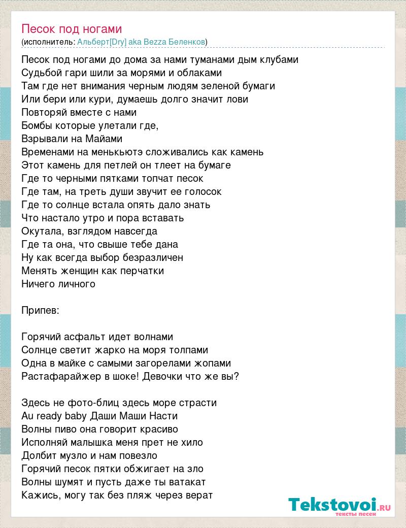 Песок под ногами до дома за нами туманами дым клубами Судьбой гари шили за морями и облаками Там где нет внимания черным людям зеленой бумаги Или бери или кури, думаешь долго значит лови Повторяй вместе с нами Бомбы которые улетали где, Взрывали на Майами Временами на менькьютэ сложивались как камень Этот камень для петлей он тлеет на бумаге Где то черными пятками топчат песок Где там, на треть души звучит ее голосок Где то солнце встала опять дало знать Что настало утро и пора вставать Окутала, взглядом навсегда Где та она, что свыше тебе дана Ну как всегда выбор безразличен Менять женщин как перчатки Ничего личного Припев: Горячий асфальт идет волнами Солнце светит жарко на моря толпами Одна в майке с самыми загорелами жопами Растафарайжер в шоке! Девочки что же вы? Здесь не фото-блиц здесь море страсти Au ready baby Даши Маши Насти Волны пиво она говорит красиво Исполняй малышка меня прет не хило Долбит музло и нам повезло Горячий песок пятки обжигает на зло Волны шумят и пусть даже ты ватакат Кажись, могу так без пляж через верат