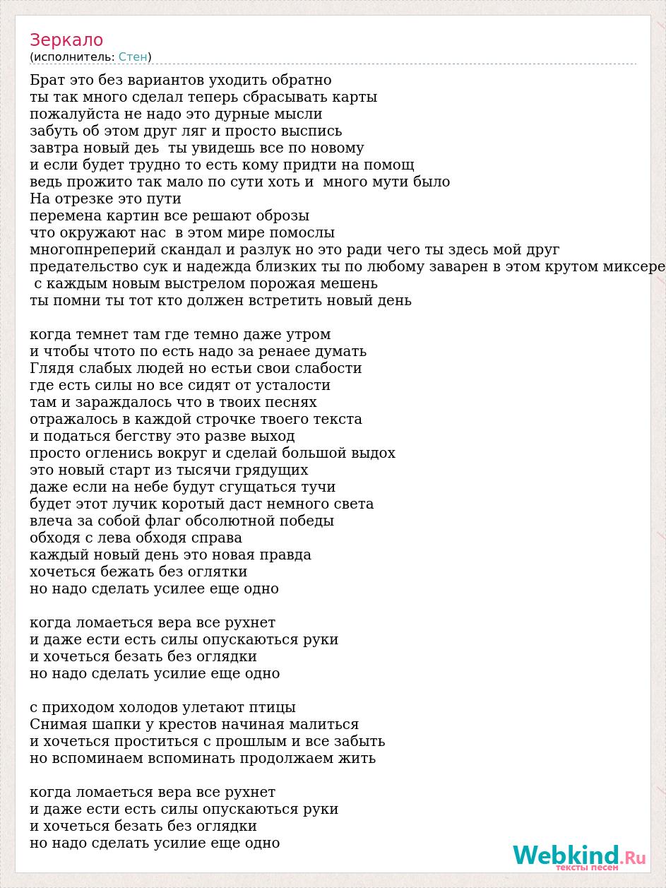 Брат это без вариантов уходить обратно ты так много сделал теперь сбрасывать карты пожалуйста не надо это дурные мысли забуть об этом друг ляг и просто выспись завтра новый деь ты увидешь все по новому и если будет трудно то есть кому придти на помощ ведь прожито так мало по сути хоть и много мути было На отрезке это пути перемена картин все решают оброзы что окружают нас в этом мире помослы многопнреперий скандал и разлук но это ради чего ты здесь мой друг предательство сук и надежда близких ты по любому заварен в этом крутом миксере с каждым новым выстрелом порожая мешень ты помни ты тот кто должен встретить новый день когда темнет там где темно даже утром и чтобы чтото по есть надо за ренаее думать Глядя слабых людей но естьи свои слабости где есть силы но все сидят от усталости там и зараждалось что в твоих песнях отражалось в каждой строчке твоего текста и податься бегству это разве выход просто огленись вокруг и сделай большой выдох это новый старт из тысячи грядущих даже если на небе будут сгущаться тучи будет этот лучик коротый даст немного света влеча за собой флаг обсолютной победы обходя с лева обходя справа каждый новый день это новая правда хочеться бежать без оглятки но надо сделать усилее еще одно когда ломаеться вера все рухнет и даже ести есть силы опускаються руки и хочеться безать без оглядки но надо сделать усилие еще одно с приходом холодов улетают птицы Снимая шапки у крестов начиная малиться и хочеться проститься с прошлым и все забыть но вспоминаем вспоминать продолжаем жить когда ломаеться вера все рухнет и даже ести есть силы опускаються руки и хочеться безать без оглядки но надо сделать усилие еще одно