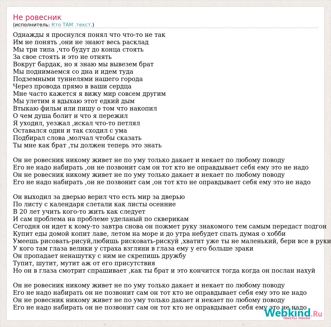 Однажды я проснулся понял что что-то не так Им не понять ,они не знают весь расклад Мы три типа ,что будут до конца стоять За свое стоять и это не отнять Вокруг бардак, но я знаю мы вывезем брат Мы поднимаемся со дна и идем туда Подземными туннелями нашего города Через провода прямо в ваши сердца Мне часто кажется я вижу мир совсем другим Мы улетим я вдыхаю этот едкий дым Втыкаю фильм или пишу о том что накопил О чем душа болит и что я пережил Я уходил, уезжал ,искал что-то петлял Оставался один и так сходил с ума Подбирал слова ,молчал чтобы сказать Ты мне как брат ,ты должен теперь это знать Он не ровесник никому живет не по уму только дакает и некает по любому поводу Его не надо набирать ,он не позвонит сам он тот кто не оправдывает себя ему это не надо Он не ровесник никому живет не по уму только дакает и некает по любому поводу Его не надо набирать ,он не позвонит сам ,он тот кто не оправдывает себя ему это не надо Он выходил за дверью верил что есть мир за дверью По листу с календаря слетали как листы осенние В 20 лет учить кого-то жить как следует И сам проблема на проблеме уделаный по скверикам Сегодня он идет к кому-то завтра снова он пожмет руку знакомого тем самым передаст подгон Купит еды домой копит лаве, летом на море и до утра небудет спать думая о хобби Умеешь рисовать-рисуй,любишь рисковать-рискуй ,хватит уже ты не маленький, бери все в руки У кого там глаза велики у страха взгляни в глаза ему у его больше зраки Он пропадает ненашутку с ним не скрепишь дружбу Тупит, шутит, мутит аж от его присутствия Но он в глаза смотрит спрашивает ,как ты брат и это кончится тогда когда он послан нахуй Он не ровесник никому живет не по уму только дакает и некает по любому поводу Его не надо набирать он не позвонит сам он тот кто не оправдывает себя ему это не надо Он не ровесник никому живет не по уму только дакает и некает по любому поводу Его не надо набирать он не позвонит сам он тот кто не оправдывает себя ему это не надо