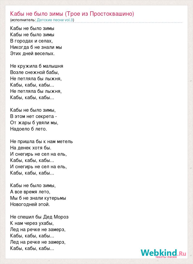 Кабы не было зимы Кабы не было зимы В городах и селах, Никогда б не знали мы Этих дней веселых. Не кружила б малышня Возле снежной бабы, Не петляла бы лыжня, Кабы, кабы, кабы... Не петляла бы лыжня, Кабы, кабы, кабы... Кабы не было зимы, В этом нет секрета - От жары б увяли мы, Надоело б лето. Не пришла бы к нам метель На денек хотя бы. И снегирь не сел на ель, Кабы, кабы, кабы... И снегирь не сел на ель, Кабы, кабы, кабы... Кабы не было зимы, А все время лето, Мы б не знали кутерьмы Новогодней этой. Не спешил бы Дед Мороз К нам через ухабы, Лед на речке не замерз, Кабы, кабы, кабы... Лед на речке не замерз, Кабы, кабы, кабы...