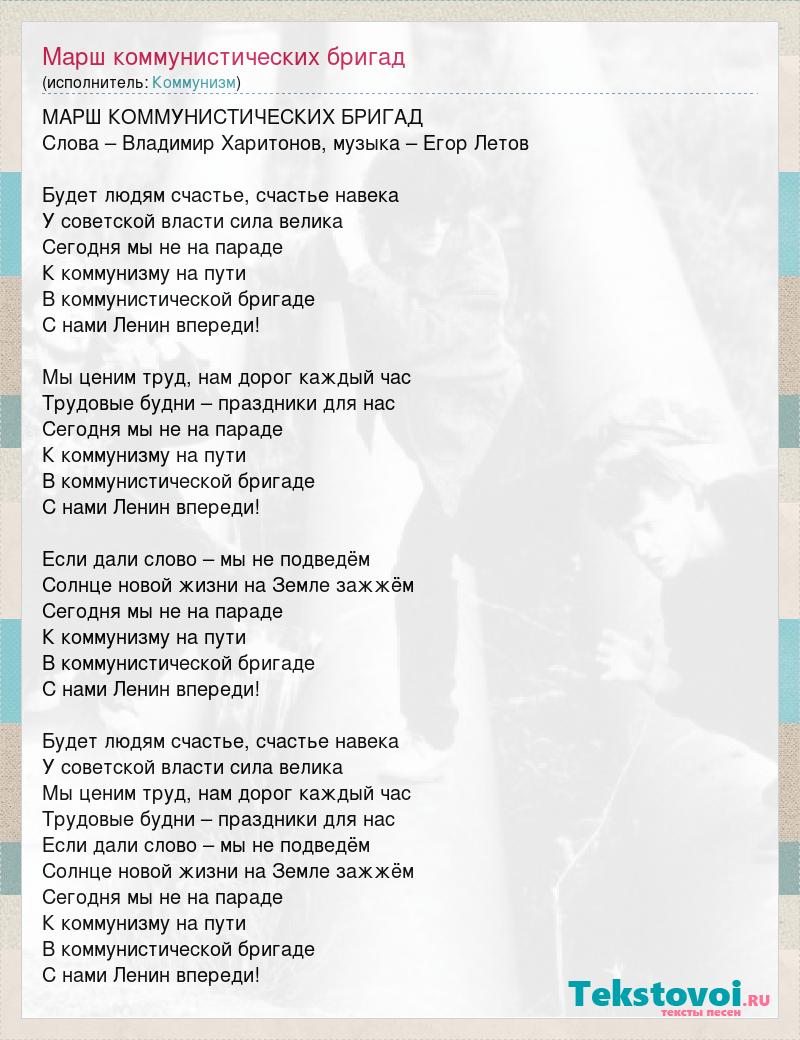 МАРШ КОММУНИСТИЧЕСКИХ БРИГАД Слова – Владимир Харитонов, музыка – Егор Летов Будет людям счастье, счастье навека У советской власти сила велика Сегодня мы не на параде К коммунизму на пути В коммунистической бригаде С нами Ленин впереди! Мы ценим труд, нам дорог каждый час Трудовые будни – праздники для нас Сегодня мы не на параде К коммунизму на пути В коммунистической бригаде С нами Ленин впереди! Если дали слово – мы не подведём Солнце новой жизни на Земле зажжём Сегодня мы не на параде К коммунизму на пути В коммунистической бригаде С нами Ленин впереди! Будет людям счастье, счастье навека У советской власти сила велика Мы ценим труд, нам дорог каждый час Трудовые будни – праздники для нас Если дали слово – мы не подведём Солнце новой жизни на Земле зажжём Сегодня мы не на параде К коммунизму на пути В коммунистической бригаде С нами Ленин впереди!