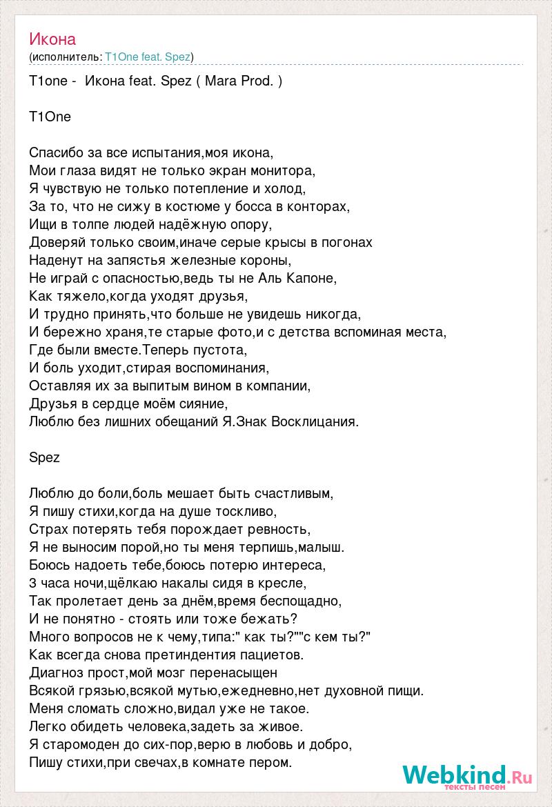T1one - Икона feat. Spez ( Mara Prod. ) T1One Спасибо за все испытания,моя икона, Мои глаза видят не только экран монитора, Я чувствую не только потепление и холод, За то, что не сижу в костюме у босса в конторах, Ищи в толпе людей надёжную опору, Доверяй только своим,иначе серые крысы в погонах Наденут на запястья железные короны, Не играй с опасностью,ведь ты не Аль Капоне, Как тяжело,когда уходят друзья, И трудно принять,что больше не увидешь никогда, И бережно храня,те старые фото,и с детства вспоминая места, Где были вместе.Теперь пустота, И боль уходит,стирая воспоминания, Оставляя их за выпитым вином в компании, Друзья в сердце моём сияние, Люблю без лишних обещаний Я.Знак Восклицания. Spez Люблю до боли,боль мешает быть счастливым, Я пишу стихи,когда на душе тоскливо, Страх потерять тебя порождает ревность, Я не выносим порой,но ты меня терпишь,малыш. Боюсь надоеть тебе,боюсь потерю интереса, 3 часа ночи,щёлкаю накалы сидя в кресле, Так пролетает день за днём,время беспощадно, И не понятно - стоять или тоже бежать? Много вопросов не к чему,типа:" как ты?""с кем ты?" Как всегда снова претиндентия пациетов. Диагноз прост,мой мозг перенасыщен Всякой грязью,всякой мутью,ежедневно,нет духовной пищи. Меня сломать сложно,видал уже не такое. Легко обидеть человека,задеть за живое. Я старомоден до сих-пор,верю в любовь и добро, Пишу стихи,при свечах,в комнате пером.