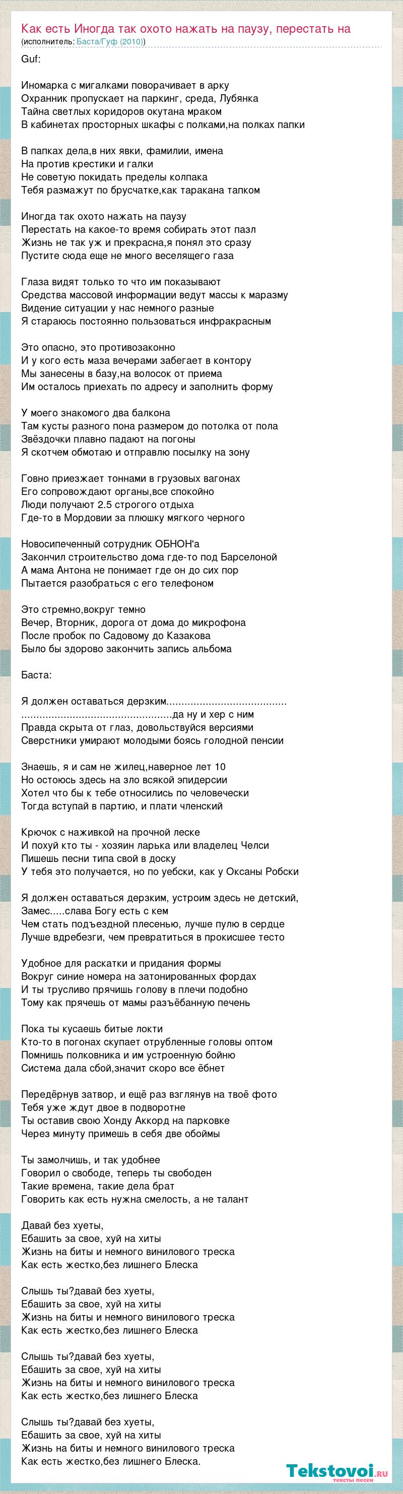 Guf: Иномарка с мигалками поворачивает в арку Охранник пропускает на паркинг, среда, Лубянка Тайна светлых коридоров окутана мраком В кабинетах просторных шкафы с полками,на полках папки В папках дела,в них явки, фамилии, имена На против крестики и галки Не советую покидать пределы колпака Тебя размажут по брусчатке,как таракана тапком Иногда так охото нажать на паузу Перестать на какое-то время собирать этот пазл Жизнь не так уж и прекрасна,я понял это сразу Пустите сюда еще не много веселящего газа Глаза видят только то что им показывают Средства массовой информации ведут массы к маразму Видение ситуации у нас немного разные Я стараюсь постоянно пользоваться инфракрасным Это опасно, это противозаконно И у кого есть маза вечерами забегает в контору Мы занесены в базу,на волосок от приема Им осталось приехать по адресу и заполнить форму У моего знакомого два балкона Там кусты разного пона размером до потолка от пола Звёздочки плавно падают на погоны Я скотчем обмотаю и отправлю посылку на зону Говно приезжает тоннами в грузовых вагонах Его сопровождают органы,все спокойно Люди получают 2.5 строгого отдыха Где-то в Мордовии за плюшку мягкого черного Новосипеченный сотрудник ОБНОН'а Закончил строительство дома где-то под Барселоной А мама Антона не понимает где он до сих пор Пытается разобраться с его телефоном Это стремно,вокруг темно Вечер, Вторник, дорога от дома до микрофона После пробок по Садовому до Казакова Было бы здорово закончить запись альбома Баста: Я должен оставаться дерзким........................................ ..................................................да ну и хер с ним Правда скрыта от глаз, довольствуйся версиями Сверстники умирают молодыми боясь голодной пенсии Знаешь, я и сам не жилец,наверное лет 10 Но остоюсь здесь на зло всякой эпидерсии Хотел что бы к тебе относились по человечески Тогда вступай в партию, и плати членский Крючок с наживкой на прочной леске И похуй кто ты - хозяин ларька или владелец Челси Пишешь песни типа свой в доску У тебя это получается, но по уебски, как у Оксаны Робски Я должен оставаться дерзким, устроим здесь не детский, Замес.....слава Богу есть с кем Чем стать подъездной плесенью, лучше пулю в сердце Лучше вдребезги, чем превратиться в прокисшее тесто Удобное для раскатки и придания формы Вокруг синие номера на затонированных фордах И ты трусливо прячишь голову в плечи подобно Тому как прячешь от мамы разъёбанную печень Пока ты кусаешь битые локти Кто-то в погонах скупает отрубленные головы оптом Помнишь полковника и им устроенную бойню Система дала сбой,значит скоро все ёбнет Передёрнув затвор, и ещё раз взглянув на твоё фото Тебя уже ждут двое в подворотне Ты оставив свою Хонду Аккорд на парковке Через минуту примешь в себя две обоймы Ты замолчишь, и так удобнее Говорил о свободе, теперь ты свободен Такие времена, такие дела брат Говорить как есть нужна смелость, а не талант Давай без хуеты, Ебашить за свое, хуй на хиты Жизнь на биты и немного винилового треска Как есть жестко,без лишнего Блеска Слышь ты?давай без хуеты, Ебашить за свое, хуй на хиты Жизнь на биты и немного винилового треска Как есть жестко,без лишнего Блеска Слышь ты?давай без хуеты, Ебашить за свое, хуй на хиты Жизнь на биты и немного винилового треска Как есть жестко,без лишнего Блеска Слышь ты?давай без хуеты, Ебашить за свое, хуй на хиты Жизнь на 