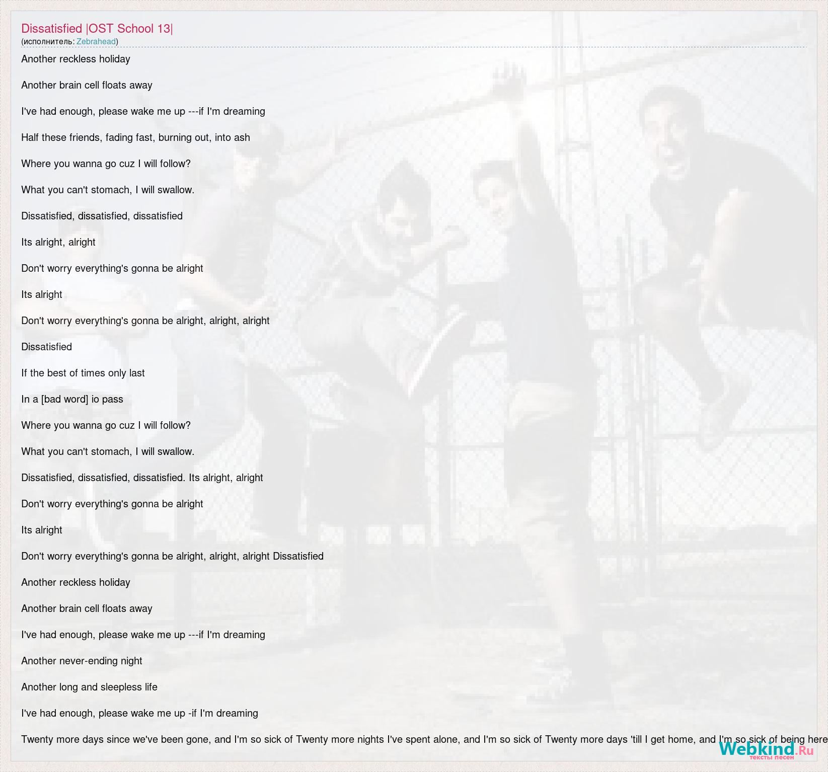 Another reckless holiday Another brain cell floats away I've had enough, please wake me up ---if I'm dreaming Half these friends, fading fast, burning out, into ash Where you wanna go cuz I will follow? What you can't stomach, I will swallow. Dissatisfied, dissatisfied, dissatisfied Its alright, alright Don't worry everything's gonna be alright Its alright Don't worry everything's gonna be alright, alright, alright Dissatisfied If the best of times only last In a [bad word] io pass Where you wanna go cuz I will follow? What you can't stomach, I will swallow. Dissatisfied, dissatisfied, dissatisfied. Its alright, alright Don't worry everything's gonna be alright Its alright Don't worry everything's gonna be alright, alright, alright Dissatisfied Another reckless holiday Another brain cell floats away I've had enough, please wake me up ---if I'm dreaming Another never-ending night Another long and sleepless life I've had enough, please wake me up -if I'm dreaming Twenty more days since we've been gone, and I'm so sick of Twenty more nights I've spent alone, and I'm so sick of Twenty more days 'till I get home, and I'm so sick of being here