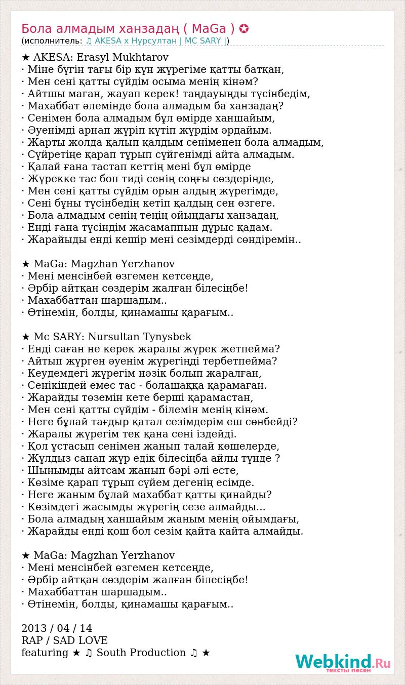 ★ AKESA: Erasyl Mukhtarov · Міне бүгін тағы бір күн жүрегіме қатты батқан, · Мен сені қатты сүйдім осыма менің кінәм? · Айтшы маган, жауап керек! таңдауыңды түсінбедім, · Махаббат әлемінде бола алмадым ба ханзадаң? · Сенімен бола алмадым бұл өмірде ханшайым, · Әуенімді арнап жүріп күтіп жүрдім әрдайым. · Жарты жолда қалып қалдым сеніменен бола алмадым, · Сүйретіңе қарап тұрып сүйгенімді айта алмадым. · Қалай ғана тастап кеттің мені бұл өмірде · Жүрекке тас боп тиді сенің соңғы сөздеріңде, · Мен сені қатты сүйдім орын алдың жүрегімде, · Сені бұны түсінбедің кетіп қалдың сен өзгеге. · Бола алмадым сенің теңің ойыңдағы ханзадаң, · Енді ғана түсіндім жасамаппын дұрыс қадам. · Жарайыды енді кешір мені сезімдерді сөндіремін.. ★ MaGa: Magzhan Yerzhanov · Мені менсінбей өзгемен кетсеңде, · Әрбір айтқан сөздерім жалған білесіңбе! · Махаббаттан шаршадым.. · Өтінемін, болды, қинамашы қарағым.. ★ Mc SARY: Nursultan Tynysbek · Енді саған не керек жаралы жүрек жетпейма? · Айтып жүрген әуенім жүрегіңді тербетпейма? · Кеудемдегі жүрегім нәзік болып жаралған, · Сенікіндей емес тас - болашаққа қарамаған. · Жарайды төземін кете берші қарамастан, · Мен сені қатты сүйдім - білемін менің кінәм. · Неге бұлай тағдыр қатал сезімдерім еш сөнбейді? · Жаралы жүрегім тек қана сені іздейді. · Қол ұстасып сенімен жанып талай көшелерде, · Жұлдыз санап жүр едік білесіңба айлы түнде ? · Шынымды айтсам жанып бәрі әлі есте, · Көзіме қарап тұрып сүйем дегенің есімде. · Неге жаным бұлай махаббат қатты қинайды? · Көзімдегі жасымды жүрегің сезе алмайды... · Бола алмадың ханшайым жаным менің ойымдағы, · Жарайды енді қош бол сезім қайта қайта алмайды. ★ MaGa: Magzhan Yerzhanov · Мені менсінбей өзгемен кетсеңде, · Әрбір айтқан сөздерім жалған білесіңбе! · Махаббаттан шаршадым.. · Өтінемін, болды, қинамашы қарағым.. 2013 / 04 / 14 RAP / SAD LOVE featuring ★ ♫ South Production ♫ ★