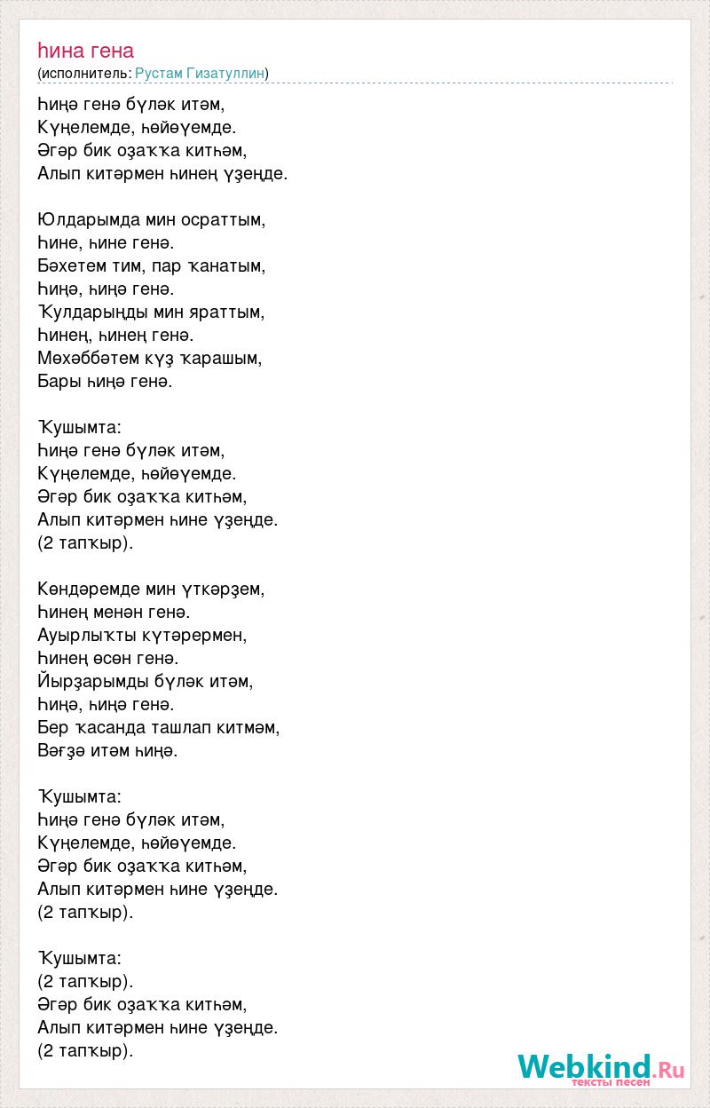Һиңә генә бүләк итәм, Күңелемде, һөйөүемде. Әгәр бик оҙаҡҡа китһәм, Алып китәрмен һинең үҙеңде. Юлдарымда мин осраттым, Һине, һине генә. Бәхетем тим, пар ҡанатым, Һиңә, һиңә генә. Ҡулдарыңды мин яраттым, Һинең, һинең генә. Мөхәббәтем күҙ ҡарашым, Бары һиңә генә. Ҡушымта: Һиңә генә бүләк итәм, Күңелемде, һөйөүемде. Әгәр бик оҙаҡҡа китһәм, Алып китәрмен һине үҙеңде. (2 тапҡыр). Көндәремде мин үткәрҙем, Һинең менән генә. Ауырлыҡты күтәрермен, Һинең өсөн генә. Йырҙарымды бүләк итәм, Һиңә, һиңә генә. Бер ҡасанда ташлап китмәм, Вәғҙә итәм һиңә. Ҡушымта: Һиңә генә бүләк итәм, Күңелемде, һөйөүемде. Әгәр бик оҙаҡҡа китһәм, Алып китәрмен һине үҙеңде. (2 тапҡыр). Ҡушымта: (2 тапҡыр). Әгәр бик оҙаҡҡа китһәм, Алып китәрмен һине үҙеңде. (2 тапҡыр).
