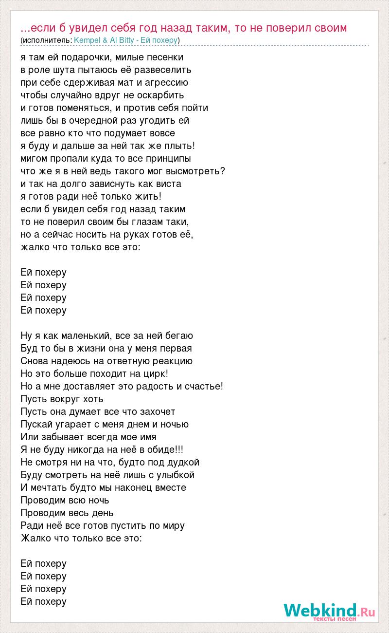 я там ей подарочки, милые песенки в роле шута пытаюсь её развеселить при себе сдерживая мат и агрессию чтобы случайно вдруг не оскарбить и готов поменяться, и против себя пойти лишь бы в очередной раз угодить ей все равно кто что подумает вовсе я буду и дальше за ней так же плыть! мигом пропали куда то все принципы что же я в ней ведь такого мог высмотреть? и так на долго зависнуть как виста я готов ради неё только жить! если б увидел себя год назад таким то не поверил своим бы глазам таки, но а сейчас носить на руках готов её, жалко что только все это: Ей похеру Ей похеру Ей похеру Ей похеру Ну я как маленький, все за ней бегаю Буд то бы в жизни она у меня первая Снова надеюсь на ответную реакцию Но это больше походит на цирк! Но а мне доставляет это радость и счастье! Пусть вокруг хоть Пусть она думает все что захочет Пускай угарает с меня днем и ночью Или забывает всегда мое имя Я не буду никогда на неё в обиде!!! Не смотря ни на что, будто под дудкой Буду смотреть на неё лишь с улыбкой И мечтать будто мы наконец вместе Проводим всю ночь Проводим весь день Ради неё все готов пустить по миру Жалко что только все это: Ей похеру Ей похеру Ей похеру Ей похеру