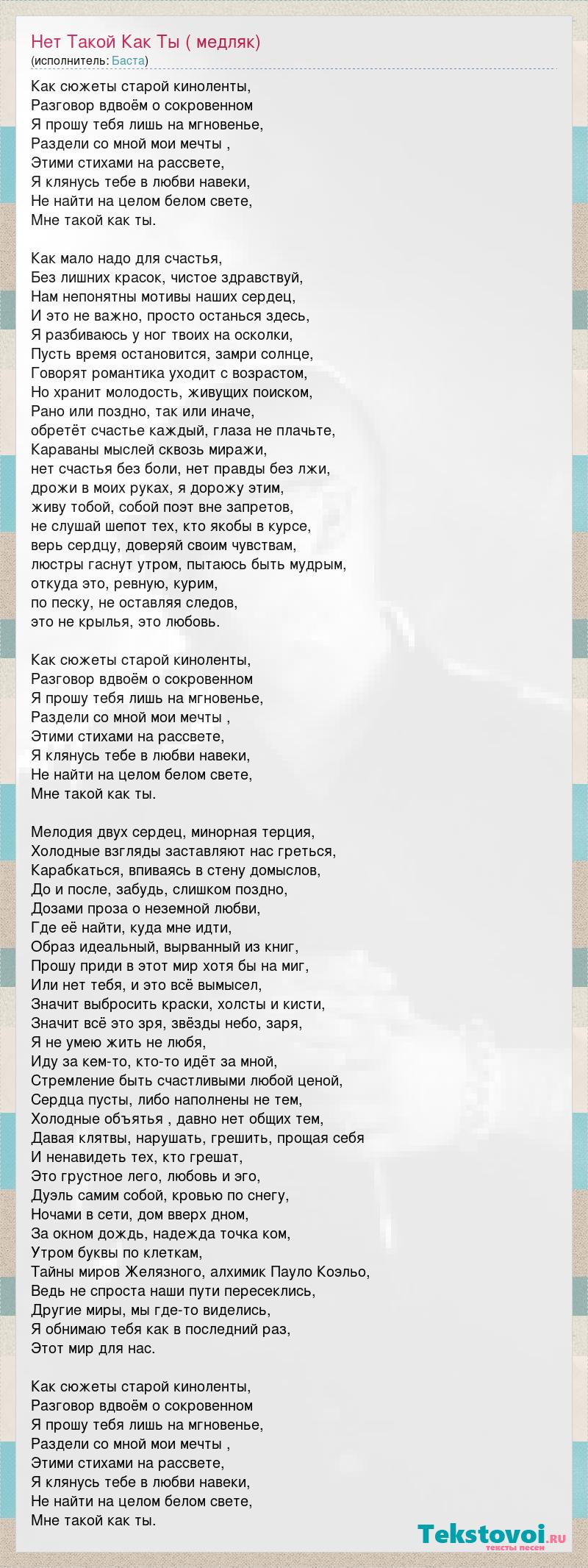 Как сюжеты старой киноленты, Разговор вдвоём о сокровенном Я прошу тебя лишь на мгновенье, Раздели со мной мои мечты , Этими стихами на рассвете, Я клянусь тебе в любви навеки, Не найти на целом белом свете, Мне такой как ты. Как мало надо для счастья, Без лишних красок, чистое здравствуй, Нам непонятны мотивы наших сердец, И это не важно, просто останься здесь, Я разбиваюсь у ног твоих на осколки, Пусть время остановится, замри солнце, Говорят романтика уходит с возрастом, Но хранит молодость, живущих поиском, Рано или поздно, так или иначе, обретёт счастье каждый, глаза не плачьте, Караваны мыслей сквозь миражи, нет счастья без боли, нет правды без лжи, дрожи в моих руках, я дорожу этим, живу тобой, собой поэт вне запретов, не слушай шепот тех, кто якобы в курсе, верь сердцу, доверяй своим чувствам, люстры гаснут утром, пытаюсь быть мудрым, откуда это, ревную, курим, по песку, не оставляя следов, это не крылья, это любовь. Как сюжеты старой киноленты, Разговор вдвоём о сокровенном Я прошу тебя лишь на мгновенье, Раздели со мной мои мечты , Этими стихами на рассвете, Я клянусь тебе в любви навеки, Не найти на целом белом свете, Мне такой как ты. Мелодия двух сердец, минорная терция, Холодные взгляды заставляют нас греться, Карабкаться, впиваясь в стену домыслов, До и после, забудь, слишком поздно, Дозами проза о неземной любви, Где её найти, куда мне идти, Образ идеальный, вырванный из книг, Прошу приди в этот мир хотя бы на миг, Или нет тебя, и это всё вымысел, Значит выбросить краски, холсты и кисти, Значит всё это зря, звёзды небо, заря, Я не умею жить не любя, Иду за кем-то, кто-то идёт за мной, Стремление быть счастливыми любой ценой, Сердца пусты, либо наполнены не тем, Холодные объятья , давно нет общих тем, Давая клятвы, нарушать, грешить, прощая себя И ненавидеть тех, кто грешат, Это грустное лего, любовь и эго, Дуэль самим собой, кровью по снегу, Ночами в сети, дом вверх дном, За окном дождь, надежда точка ком, Утром буквы по клеткам, Тайны миров Желязного, алхимик Пауло Коэльо, Ведь не спроста наши пути пересеклись, Другие миры, мы где-то виделись, Я обнимаю тебя как в последний раз, Этот мир для нас. Как сюжеты старой киноленты, Разговор вдвоём о сокровенном Я прошу тебя лишь на мгновенье, Раздели со мной мои мечты , Этими стихами на рассвете, Я клянусь тебе в любви навеки, Не найти на целом белом свете, Мне такой как ты.