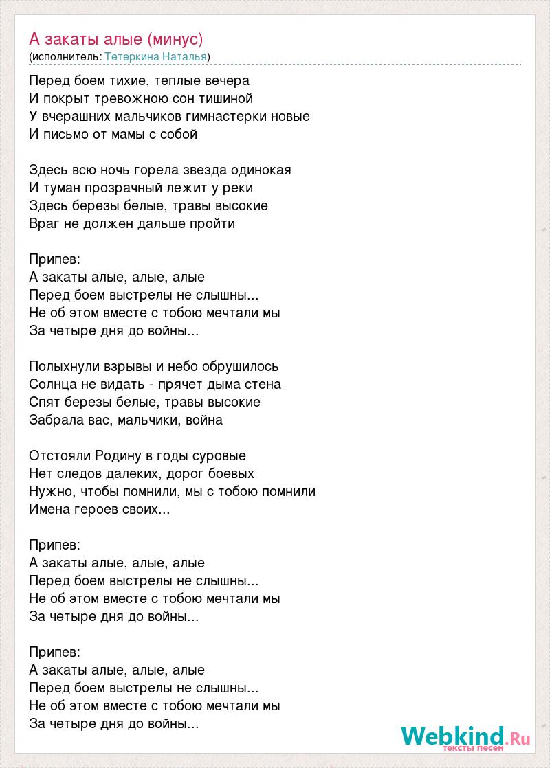 Перед боем тихие, теплые вечера И покрыт тревожною сон тишиной У вчерашних мальчиков гимнастерки новые И письмо от мамы с собой Здесь всю ночь горела звезда одинокая И туман прозрачный лежит у реки Здесь березы белые, травы высокие Враг не должен дальше пройти Припев: А закаты алые, алые, алые Перед боем выстрелы не слышны... Не об этом вместе с тобою мечтали мы За четыре дня до войны... Полыхнули взрывы и небо обрушилось Солнца не видать - прячет дыма стена Спят березы белые, травы высокие Забрала вас, мальчики, война Отстояли Родину в годы суровые Нет следов далеких, дорог боевых Нужно, чтобы помнили, мы с тобою помнили Имена героев своих... Припев: А закаты алые, алые, алые Перед боем выстрелы не слышны... Не об этом вместе с тобою мечтали мы За четыре дня до войны... Припев: А закаты алые, алые, алые Перед боем выстрелы не слышны... Не об этом вместе с тобою мечтали мы За четыре дня до войны...