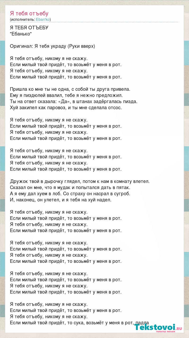 Я ТЕБЯ ОТЪЕБУ "Ебанько" Оригинал: Я тебя украду (Руки вверх) Я тебя отъебу, никому я не скажу. Если милый твой придёт, то возьмёт у меня в рот. Я тебя отъебу, никому я не скажу. Если милый твой придёт, то возьмёт у меня в рот. Пришла ко мне ты не одна, с собой ты друга привела. Ему я пиздюлей ввалил, тебе я нежно предложил. Ты на ответ сказала: «Да», в штанах задёргалась пизда. Хуй закипел как паровоз, и ты мне сделала отсос. Я тебя отъебу, никому я не скажу. Если милый твой придёт, то возьмёт у меня в рот. Я тебя отъебу, никому я не скажу. Если милый твой придёт, то возьмёт у меня в рот. Я тебя отъебу, никому я не скажу. Если милый твой придёт, то возьмёт у меня в рот. Я тебя отъебу, никому я не скажу. Если милый твой придёт, то возьмёт у меня в рот. Дружок твой в дырочку глядел, потом к нам в комнату влетел. Сказал он мне, что я мудак и попытался дать в пятак. А я ему дал хуем в лоб. Со страху он насрал в сугроб. И, наконец, он улетел, и я тебя на хуй надел. Я тебя отъебу, никому я не скажу. Если милый твой придёт, то возьмёт у меня в рот. Я тебя отъебу, никому я не скажу. Если милый твой придёт, то возьмёт у меня в рот. Я тебя отъебу, никому я не скажу. Если милый твой придёт, то возьмёт у меня в рот. Я тебя отъебу, никому я не скажу. Если милый твой придёт, то возьмёт у меня в рот. Я тебя отъебу, никому я не скажу. Если милый твой придёт, то возьмёт у меня в рот. Я тебя отъебу, никому я не скажу. Если милый твой придёт, то возьмёт у меня в рот. Я тебя отъебу, никому я не скажу. Если милый твой придёт, то возьмёт у меня в рот. Я тебя отъебу, никому я не скажу. Если милый твой придёт, то сука, возьмёт у меня в рот, падла