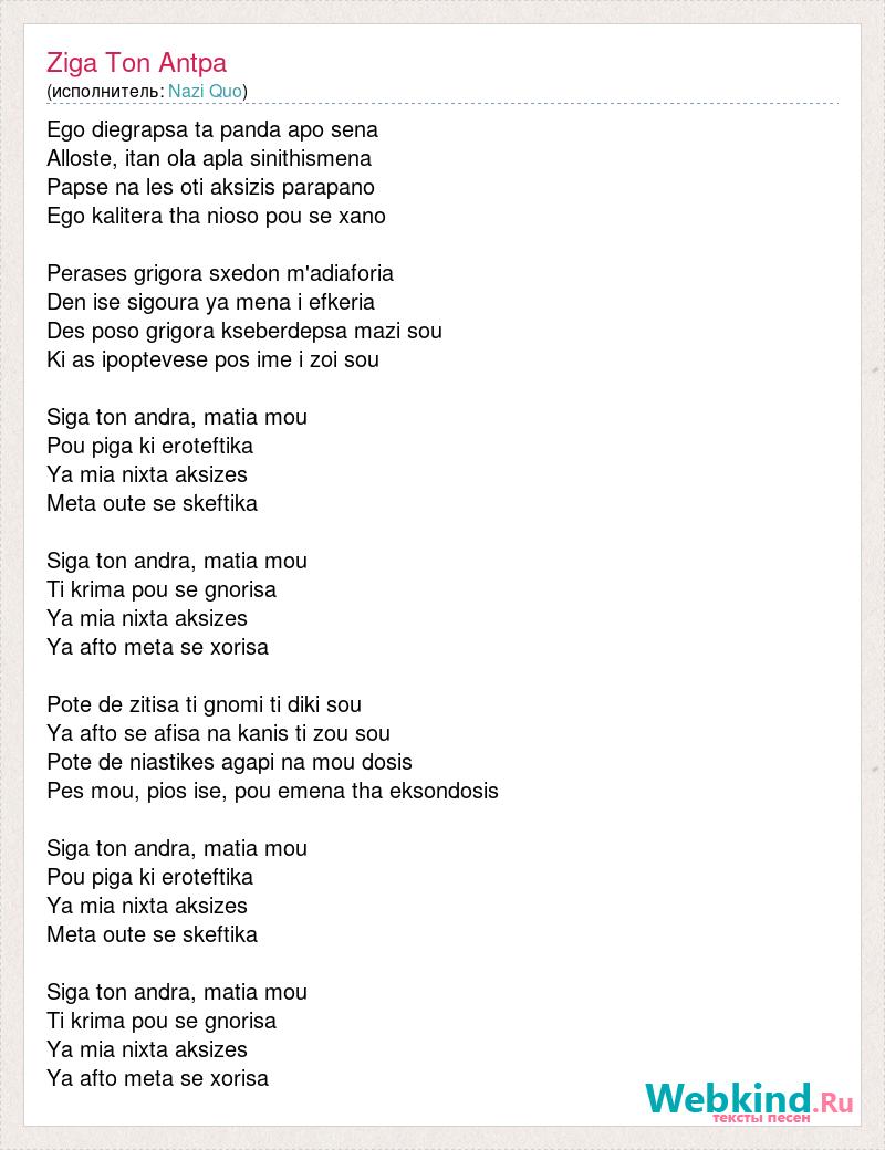 Ego diegrapsa ta panda apo sena Alloste, itan ola apla sinithismena Papse na les oti aksizis parapano Ego kalitera tha nioso pou se xano Perases grigora sxedon m'adiaforia Den ise sigoura ya mena i efkeria Des poso grigora kseberdepsa mazi sou Ki as ipoptevese pos ime i zoi sou Siga ton andra, matia mou Pou piga ki eroteftika Ya mia nixta aksizes Meta oute se skeftika Siga ton andra, matia mou Ti krima pou se gnorisa Ya mia nixta aksizes Ya afto meta se xorisa Pote de zitisa ti gnomi ti diki sou Ya afto se afisa na kanis ti zou sou Pote de niastikes agapi na mou dosis Pes mou, pios ise, pou emena tha eksondosis Siga ton andra, matia mou Pou piga ki eroteftika Ya mia nixta aksizes Meta oute se skeftika Siga ton andra, matia mou Ti krima pou se gnorisa Ya mia nixta aksizes Ya afto meta se xorisa