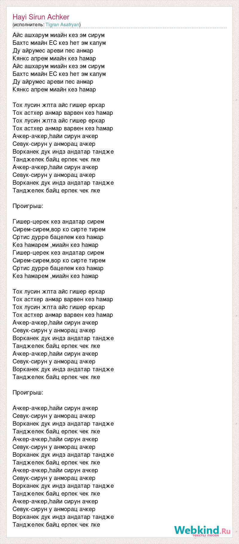 Айс ашхарум миайн кез эм сирум Бахтс миайн ЕС кез hет эм капум Ду айрумес ареви пес анмар Кянкс апрем миайн кез hамар Айс ашхарум миайн кез эм сирум Бахтс миайн ЕС кез hет эм капум Ду айрумес ареви пес анмар Кянкс апрем миайн кез hамар Тох лусин жпта айс гишер еркар Тох астхер анмар варвен кез hамар Тох лусин жпта айс гишер еркар Тох астхер анмар варвен кез hамар Ачкер-ачкер,hайи сирун ачкер Севук-сирун у анморац ачкер Ворканек дук индз андатар тандже Танджелек байц ерпек чек лке Ачкер-ачкер,hайи сирун ачкер Севук-сирун у анморац ачкер Ворканек дук индз андатар тандже Танджелек байц ерпек чек лке Проигрыш: Гишер-церек кез андатар сирем Сирем-сирем,вор ко сирте тирем Сртис дурре бацелем кез hамар Кез hамарем ,миайн кез hамар Гишер-церек кез андатар сирем Сирем-сирем,вор ко сирте тирем Сртис дурре бацелем кез hамар Кез hамарем ,миайн кез hамар Тох лусин жпта айс гишер еркар Тох астхер анмар варвен кез hамар Тох лусин жпта айс гишер еркар Тох астхер анмар варвен кез hамар Ачкер-ачкер,hайи сирун ачкер Севук-сирун у анморац ачкер Ворканек дук индз андатар тандже Танджелек байц ерпек чек лке Ачкер-ачкер,hайи сирун ачкер Севук-сирун у анморац ачкер Ворканек дук индз андатар тандже Танджелек байц ерпек чек лке Проигрыш: Ачкер-ачкер,hайи сирун ачкер Севук-сирун у анморац ачкер Ворканек дук индз андатар тандже Танджелек байц ерпек чек лке Ачкер-ачкер,hайи сирун ачкер Севук-сирун у анморац ачкер Ворканек дук индз андатар тандже Танджелек байц ерпек чек лке Ачкер-ачкер,hайи сирун ачкер Севук-сирун у анморац ачкер Ворканек дук индз андатар тандже Танджелек байц ерпек чек лке Ачкер-ачкер,hайи сирун ачкер Севук-сирун у анморац ачкер Ворканек дук индз андатар тандже Танджелек байц ерпек чек лке