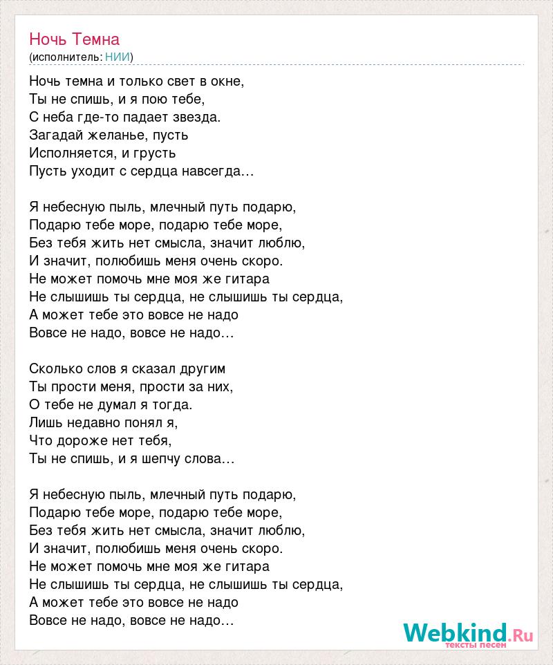 Ночь темна и только свет в окне, Ты не спишь, и я пою тебе, С неба где-то падает звезда. Загадай желанье, пусть Исполняется, и грусть Пусть уходит с сердца навсегда… Я небесную пыль, млечный путь подарю, Подарю тебе море, подарю тебе море, Без тебя жить нет смысла, значит люблю, И значит, полюбишь меня очень скоро. Не может помочь мне моя же гитара Не слышишь ты сердца, не слышишь ты сердца, А может тебе это вовсе не надо Вовсе не надо, вовсе не надо… Сколько слов я сказал другим Ты прости меня, прости за них, О тебе не думал я тогда. Лишь недавно понял я, Что дороже нет тебя, Ты не спишь, и я шепчу слова… Я небесную пыль, млечный путь подарю, Подарю тебе море, подарю тебе море, Без тебя жить нет смысла, значит люблю, И значит, полюбишь меня очень скоро. Не может помочь мне моя же гитара Не слышишь ты сердца, не слышишь ты сердца, А может тебе это вовсе не надо Вовсе не надо, вовсе не надо…