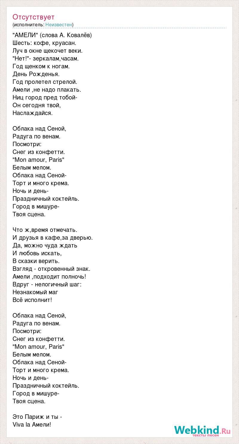 "АМЕЛИ" (слова А. Ковалёв) Шесть: кофе, круасан. Луч в окне щекочет веки. "Нет!"- зеркалам,часам. Год щенком к ногам. День Рожденья. Год пролетел стрелой. Амели ,не надо плакать. Ниц город пред тобой- Он сегодня твой, Наслаждайся. Облака над Сеной, Радуга по венам. Посмотри: Снег из конфетти. "Mon amour, Paris" Белым мелом. Облака над Сеной- Торт и много крема. Ночь и день- Праздничный коктейль. Город в мишуре- Твоя сцена. Что ж,время отмечать. И друзья в кафе,за дверью. Да, можно чуда ждать И любовь искать, В сказки верить. Взгляд - откровенный знак. Амели ,подходит полночь! Вдруг - нелогичный шаг: Незнакомый маг Всё исполнит! Облака над Сеной, Радуга по венам. Посмотри: Снег из конфетти. "Mon amour, Paris" Белым мелом. Облака над Сеной- Торт и много крема. Ночь и день- Праздничный коктейль. Город в мишуре- Твоя сцена. Это Париж и ты - Viva la Амели!