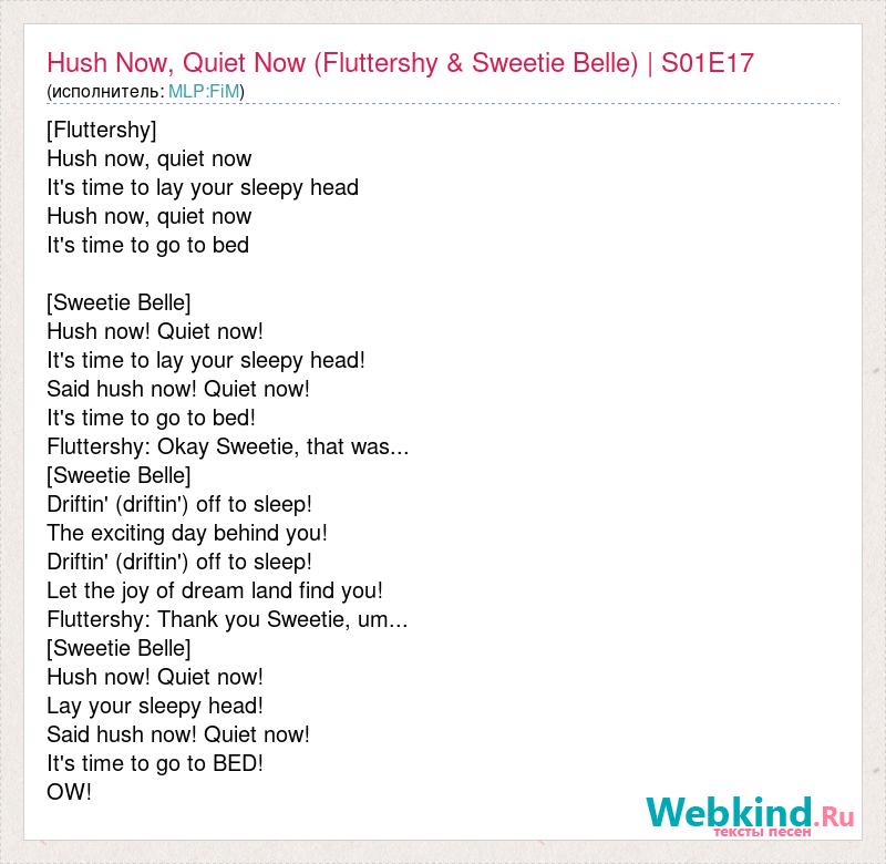[Fluttershy] Hush now, quiet now It's time to lay your sleepy head Hush now, quiet now It's time to go to bed [Sweetie Belle] Hush now! Quiet now! It's time to lay your sleepy head! Said hush now! Quiet now! It's time to go to bed! Fluttershy: Okay Sweetie, that was... [Sweetie Belle] Driftin' (driftin') off to sleep! The exciting day behind you! Driftin' (driftin') off to sleep! Let the joy of dream land find you! Fluttershy: Thank you Sweetie, um... [Sweetie Belle] Hush now! Quiet now! Lay your sleepy head! Said hush now! Quiet now! It's time to go to BED! OW!