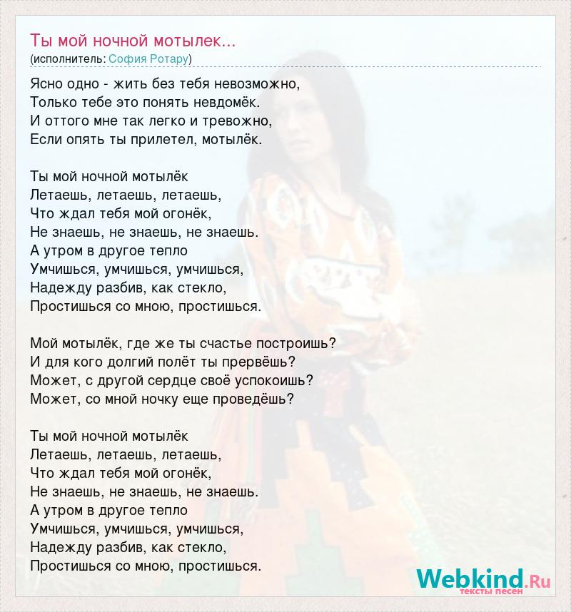 Ясно одно - жить без тебя невозможно, Только тебе это понять невдомёк. И оттого мне так легко и тревожно, Если опять ты прилетел, мотылёк. Ты мой ночной мотылёк Летаешь, летаешь, летаешь, Что ждал тебя мой огонёк, Не знаешь, не знаешь, не знаешь. А утром в другое тепло Умчишься, умчишься, умчишься, Надежду разбив, как стекло, Простишься со мною, простишься. Мой мотылёк, где же ты счастье построишь? И для кого долгий полёт ты прервёшь? Может, с другой сердце своё успокоишь? Может, со мной ночку еще проведёшь? Ты мой ночной мотылёк Летаешь, летаешь, летаешь, Что ждал тебя мой огонёк, Не знаешь, не знаешь, не знаешь. А утром в другое тепло Умчишься, умчишься, умчишься, Надежду разбив, как стекло, Простишься со мною, простишься.