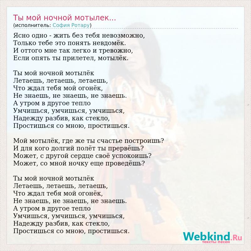 Ясно одно - жить без тебя невозможно, Только тебе это понять невдомёк. И оттого мне так легко и тревожно, Если опять ты прилетел, мотылёк. Ты мой ночной мотылёк Летаешь, летаешь, летаешь, Что ждал тебя мой огонёк, Не знаешь, не знаешь, не знаешь. А утром в другое тепло Умчишься, умчишься, умчишься, Надежду разбив, как стекло, Простишься со мною, простишься. Мой мотылёк, где же ты счастье построишь? И для кого долгий полёт ты прервёшь? Может, с другой сердце своё успокоишь? Может, со мной ночку еще проведёшь? Ты мой ночной мотылёк Летаешь, летаешь, летаешь, Что ждал тебя мой огонёк, Не знаешь, не знаешь, не знаешь. А утром в другое тепло Умчишься, умчишься, умчишься, Надежду разбив, как стекло, Простишься со мною, простишься.