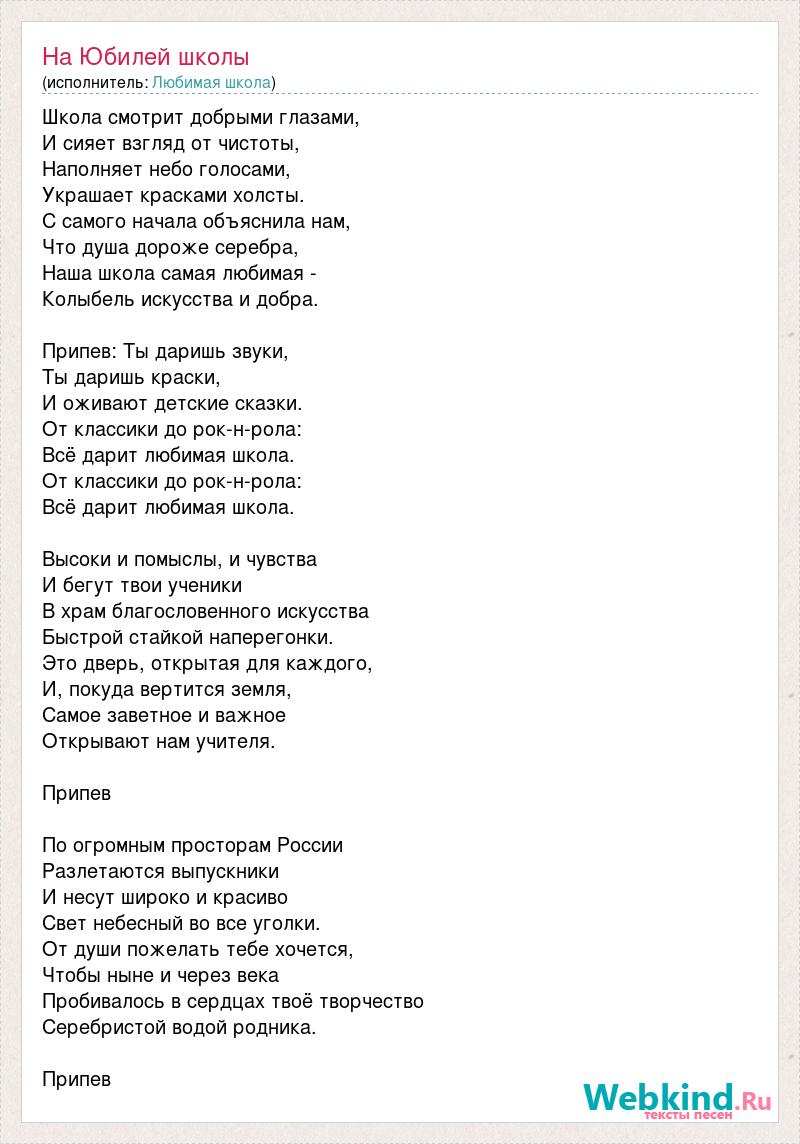 Школа смотрит добрыми глазами, И сияет взгляд от чистоты, Наполняет небо голосами, Украшает красками холсты. С самого начала объяснила нам, Что душа дороже серебра, Наша школа самая любимая - Колыбель искусства и добра. Припев: Ты даришь звуки, Ты даришь краски, И оживают детские сказки. От классики до рок-н-рола: Всё дарит любимая школа. От классики до рок-н-рола: Всё дарит любимая школа. Высоки и помыслы, и чувства И бегут твои ученики В храм благословенного искусства Быстрой стайкой наперегонки. Это дверь, открытая для каждого, И, покуда вертится земля, Самое заветное и важное Открывают нам учителя. Припев По огромным просторам России Разлетаются выпускники И несут широко и красиво Свет небесный во все уголки. От души пожелать тебе хочется, Чтобы ныне и через века Пробивалось в сердцах твоё творчество Серебристой водой родника. Припев