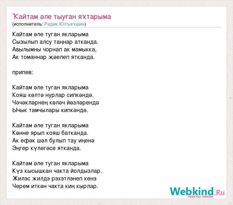Кайтам әле туган якларыма Сызылып алсу таңнар атканда. Авылымны чорнап ак мамыкка, Ак томаннар җәелеп ятканда. припев: Кайтам әле туган якларыма Кояш көлтә нурлар сипкәндә. Чәчәкләрнең көләч йөзләрендә Ычык тамчылары кипкәндә. Кайтам әле туган якларыма Көнне ярып кояш батканда. Ак ефәк шәл булып тау иңенә Эңгер күләгәсе ятканда. Кайтам әле туган якларыма Күз кысышкан чакта йолдызлар. Жилэс жилдэ рэхэтлэнеп кенэ Черем иткән чакта киң кырлар.