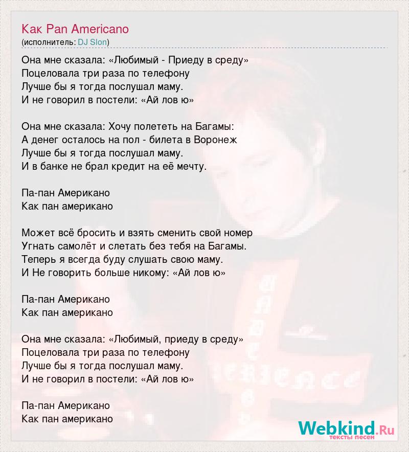 Она мне сказала: «Любимый - Приеду в среду» Поцеловала три раза по телефону Лучше бы я тогда послушал маму. И не говорил в постели: «Ай лов ю» Она мне сказала: Хочу полететь на Багамы: А денег осталось на пол - билета в Воронеж Лучше бы я тогда послушал маму. И в банке не брал кредит на её мечту. Па-пан Американо Как пан американо Может всё бросить и взять сменить свой номер Угнать самолёт и слетать без тебя на Багамы. Теперь я всегда буду слушать свою маму. И Не говорить больше никому: «Ай лов ю» Па-пан Американо Как пан американо Она мне сказала: «Любимый, приеду в среду» Поцеловала три раза по телефону Лучше бы я тогда послушал маму. И не говорил в постели: «Ай лов ю» Па-пан Американо Как пан американо