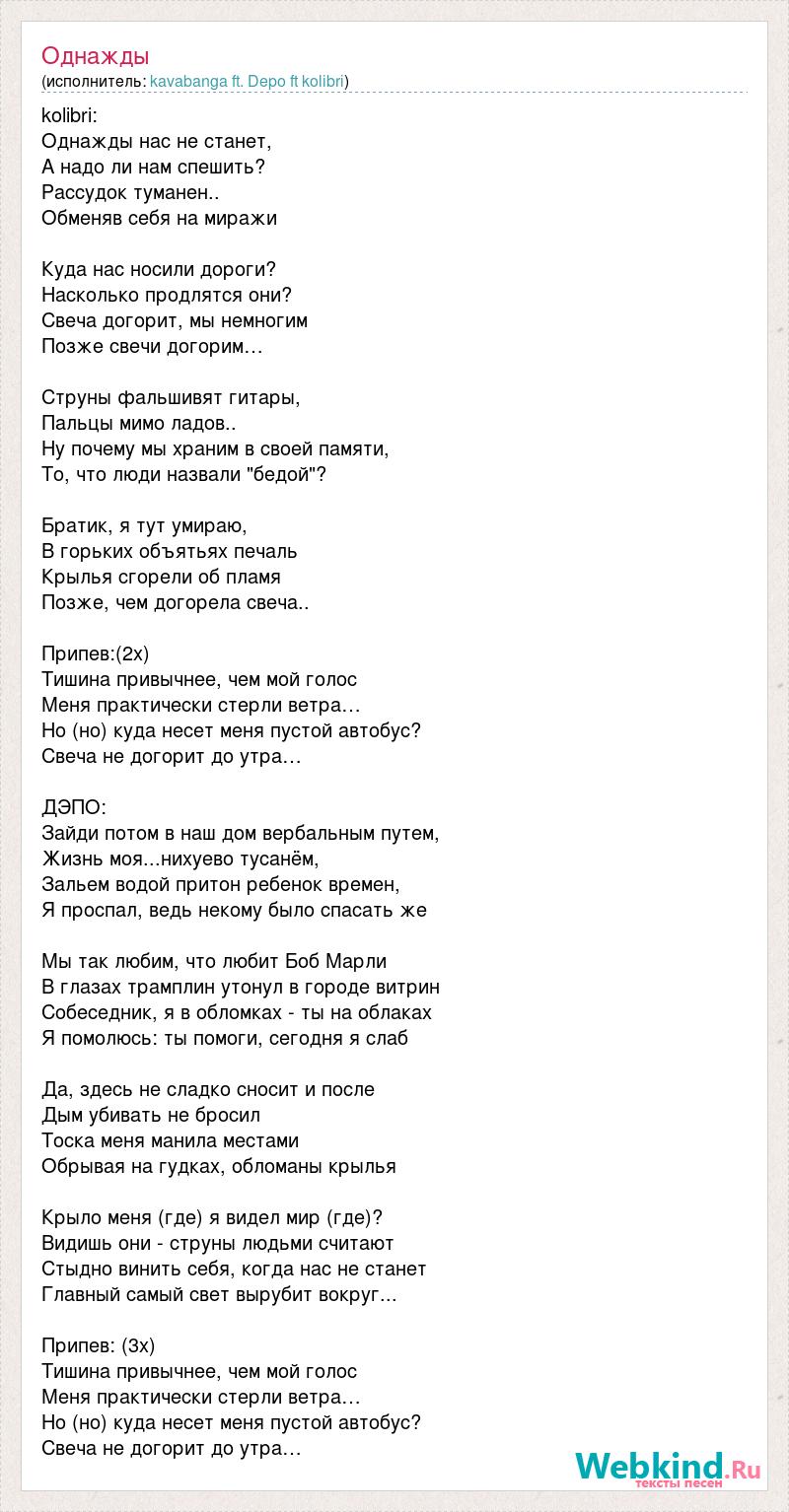 kolibri: Однажды нас не станет, А надо ли нам спешить? Рассудок туманен.. Обменяв себя на миражи Куда нас носили дороги? Насколько продлятся они? Свеча догорит, мы немногим Позже свечи догорим… Струны фальшивят гитары, Пальцы мимо ладов.. Ну почему мы храним в своей памяти, То, что люди назвали "бедой"? Братик, я тут умираю, В горьких объятьях печаль Крылья сгорели об пламя Позже, чем догорела свеча.. Припев:(2х) Тишина привычнее, чем мой голос Меня практически стерли ветра… Но (но) куда несет меня пустой автобус? Свеча не догорит до утра… ДЭПО: Зайди потом в наш дом вербальным путем, Жизнь моя...нихуево тусанём, Зальем водой притон ребенок времен, Я проспал, ведь некому было спасать же Мы так любим, что любит Боб Марли В глазах трамплин утонул в городе витрин Собеседник, я в обломках - ты на облаках Я помолюсь: ты помоги, сегодня я слаб Да, здесь не сладко сносит и после Дым убивать не бросил Тоска меня манила местами Обрывая на гудках, обломаны крылья Крыло меня (где) я видел мир (где)? Видишь они - струны людьми считают Стыдно винить себя, когда нас не станет Главный самый свет вырубит вокруг... Припев: (3х) Тишина привычнее, чем мой голос Меня практически стерли ветра… Но (но) куда несет меня пустой автобус? Свеча не догорит до утра…