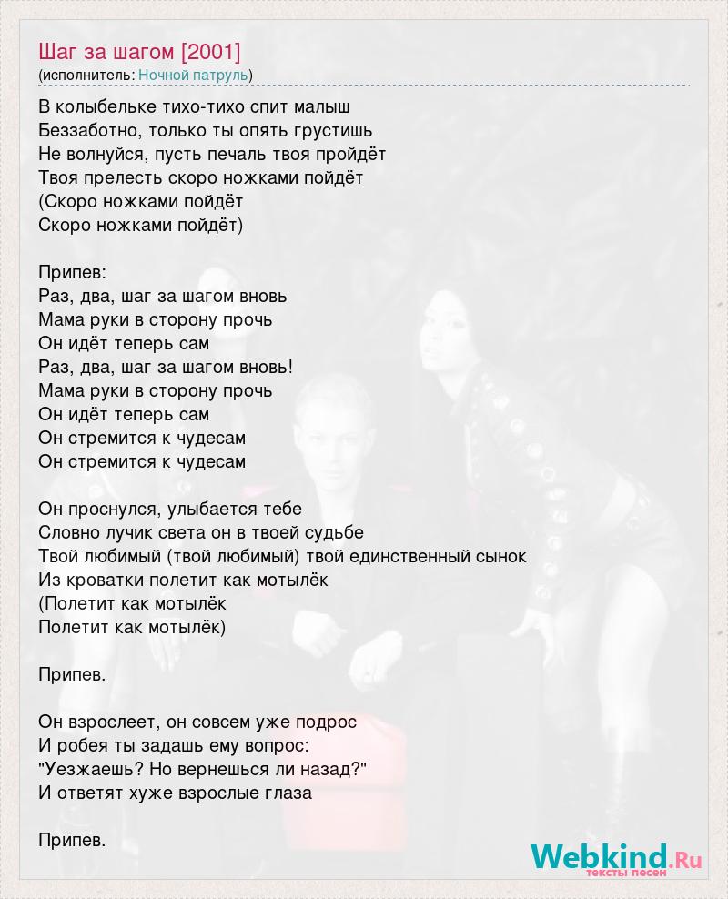 В колыбельке тихо-тихо спит малыш Беззаботно, только ты опять грустишь Не волнуйся, пусть печаль твоя пройдёт Твоя прелесть скоро ножками пойдёт (Скоро ножками пойдёт Скоро ножками пойдёт) Припев: Раз, два, шаг за шагом вновь Мама руки в сторону прочь Он идёт теперь сам Раз, два, шаг за шагом вновь! Мама руки в сторону прочь Он идёт теперь сам Он стремится к чудесам Он стремится к чудесам Он проснулся, улыбается тебе Словно лучик света он в твоей судьбе Твой любимый (твой любимый) твой единственный сынок Из кроватки полетит как мотылёк (Полетит как мотылёк Полетит как мотылёк) Припев. Он взрослеет, он совсем уже подрос И робея ты задашь ему вопрос: "Уезжаешь? Но вернешься ли назад?" И ответят хуже взрослые глаза Припев.