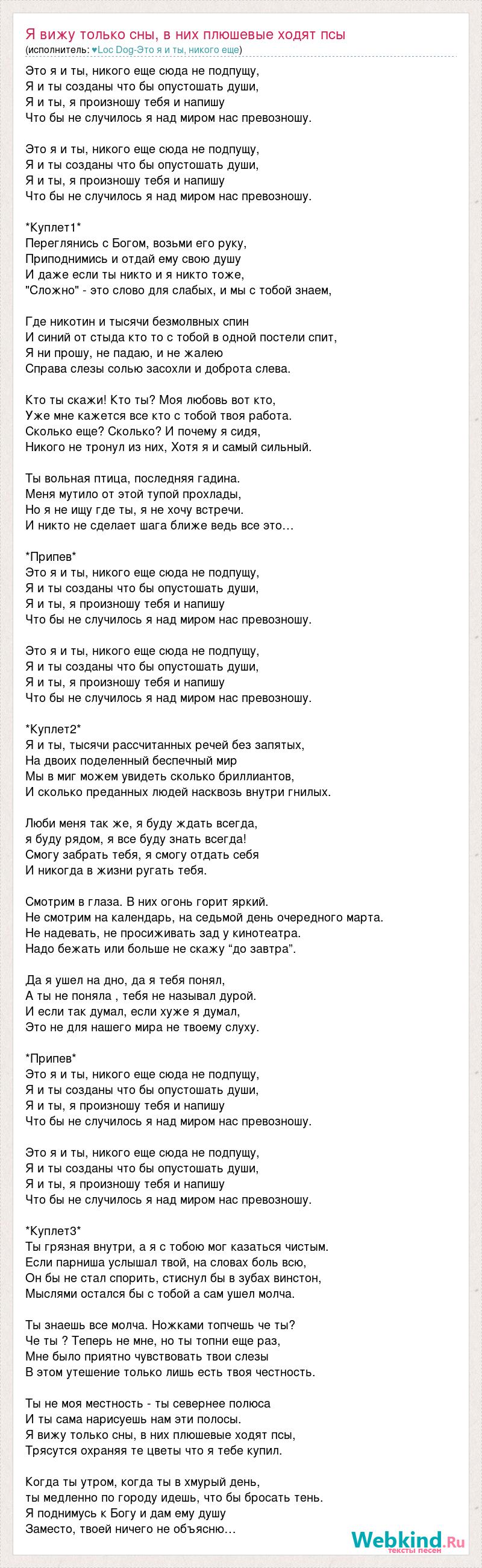 Это я и ты, никого еще сюда не подпущу, Я и ты созданы что бы опустошать души, Я и ты, я произношу тебя и напишу Что бы не случилось я над миром нас превозношу. Это я и ты, никого еще сюда не подпущу, Я и ты созданы что бы опустошать души, Я и ты, я произношу тебя и напишу Что бы не случилось я над миром нас превозношу. *Куплет1* Переглянись с Богом, возьми его руку, Приподнимись и отдай ему свою душу И даже если ты никто и я никто тоже, "Сложно" - это слово для слабых, и мы с тобой знаем, Где никотин и тысячи безмолвных спин И синий от стыда кто то с тобой в одной постели спит, Я ни прошу, не падаю, и не жалею Справа слезы солью засохли и доброта слева. Кто ты скажи! Кто ты? Моя любовь вот кто, Уже мне кажется все кто с тобой твоя работа. Сколько еще? Сколько? И почему я сидя, Никого не тронул из них, Хотя я и самый сильный. Ты вольная птица, последняя гадина. Меня мутило от этой тупой прохлады, Но я не ищу где ты, я не хочу встречи. И никто не сделает шага ближе ведь все это… *Припев* Это я и ты, никого еще сюда не подпущу, Я и ты созданы что бы опустошать души, Я и ты, я произношу тебя и напишу Что бы не случилось я над миром нас превозношу. Это я и ты, никого еще сюда не подпущу, Я и ты созданы что бы опустошать души, Я и ты, я произношу тебя и напишу Что бы не случилось я над миром нас превозношу. *Куплет2* Я и ты, тысячи рассчитанных речей без запятых, На двоих поделенный беспечный мир Мы в миг можем увидеть сколько бриллиантов, И сколько преданных людей насквозь внутри гнилых. Люби меня так же, я буду ждать всегда, я буду рядом, я все буду знать всегда! Смогу забрать тебя, я смогу отдать себя И никогда в жизни ругать тебя. Смотрим в глаза. В них огонь горит яркий. Не смотрим на календарь, на седьмой день очередного марта. Не надевать, не просиживать зад у кинотеатра. Надо бежать или больше не скажу “до завтра”. Да я ушел на дно, да я тебя понял, А ты не поняла , тебя не называл дурой. И если так думал, если хуже я думал, Это не для нашего мира не твоему слуху. *Припев* Это я и ты, никого еще сюда не подпущу, Я и ты созданы что бы опустошать души, Я и ты, я произношу тебя и напишу Что бы не случилось я над миром нас превозношу. Это я и ты, никого еще сюда не подпущу, Я и ты созданы что бы опустошать души, Я и ты, я произношу тебя и напишу Что бы не случилось я над миром нас превозношу. *Куплет3* Ты грязная внутри, а я с тобою мог казаться чистым. Если парниша услышал твой, на словах боль всю, Он бы не стал спорить, стиснул бы в зубах винстон, Мыслями остался бы с тобой а сам ушел молча. Ты знаешь все молча. Ножками топчешь че ты? Че ты ? Теперь не мне, но ты топни еще раз, Мне было приятно чувствовать твои слезы В этом утешение только лишь есть твоя честность. Ты не моя местность - ты севернее полюса И ты сама нарисуешь нам эти полосы. Я вижу только сны, в них плюшевые ходят псы, Трясутся охраняя те цветы что я тебе купил. Когда ты утром, когда ты в хмурый день, ты медленно по городу идешь, что бы бросать тень. Я поднимусь к Богу и дам ему душу Заместо, твоей ничего не объясню…