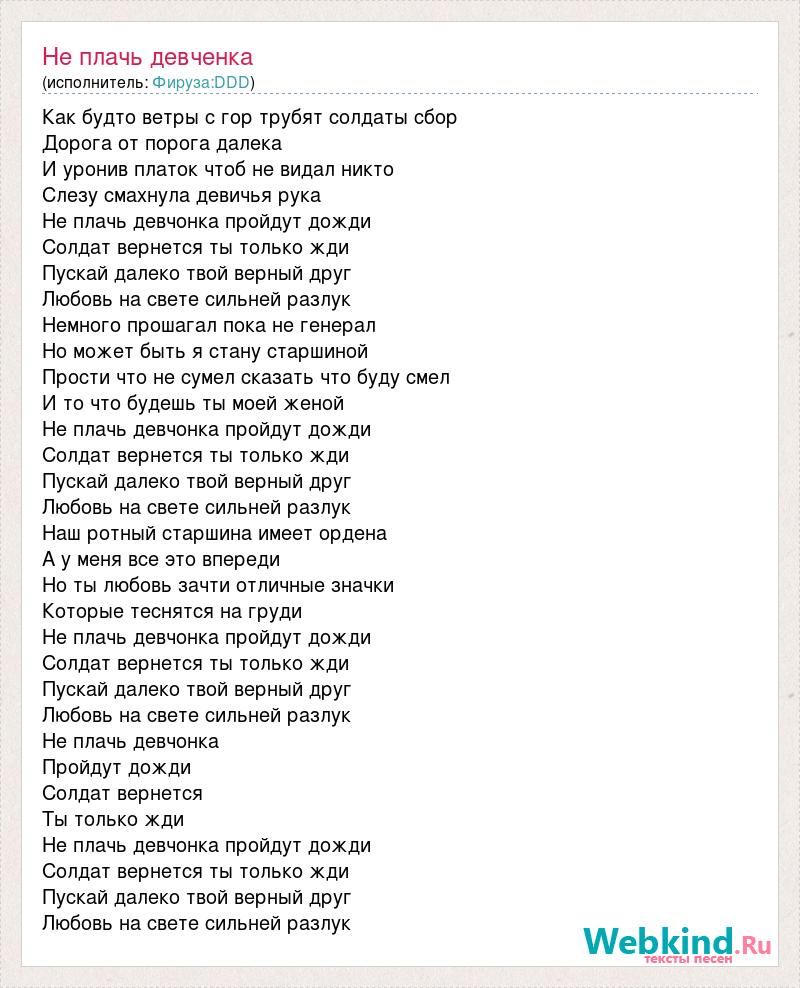 Как будто ветры с гор трубят солдаты сбор Дорога от порога далека И уронив платок чтоб не видал никто Слезу смахнула девичья рука Не плачь девчонка пройдут дожди Солдат вернется ты только жди Пускай далеко твой верный друг Любовь на свете сильней разлук Немного прошагал пока не генерал Но может быть я стану старшиной Прости что не сумел сказать что буду смел И то что будешь ты моей женой Не плачь девчонка пройдут дожди Солдат вернется ты только жди Пускай далеко твой верный друг Любовь на свете сильней разлук Наш ротный старшина имеет ордена А у меня все это впереди Но ты любовь зачти отличные значки Которые теснятся на груди Не плачь девчонка пройдут дожди Солдат вернется ты только жди Пускай далеко твой верный друг Любовь на свете сильней разлук Не плачь девчонка Пройдут дожди Солдат вернется Ты только жди Не плачь девчонка пройдут дожди Солдат вернется ты только жди Пускай далеко твой верный друг Любовь на свете сильней разлук