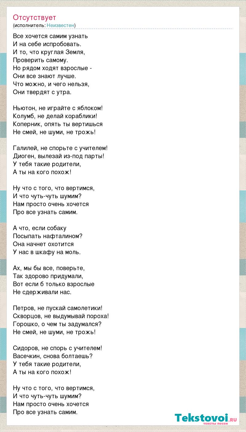Все хочется самим узнать И на себе испробовать. И то, что круглая Земля, Проверить самому. Но рядом ходят взрослые - Они все знают лучше. Что можно, и чего нельзя, Они твердят с утра. Ньютон, не играйте с яблоком! Колумб, не делай кораблики! Коперник, опять ты вертишься Не смей, не шуми, не трожь! Галилей, не спорьте с учителем! Диоген, вылезай из-под парты! У тебя такие родители, А ты на кого похож! Ну что с того, что вертимся, И что чуть-чуть шумим? Нам просто очень хочется Про все узнать самим. А что, если собаку Посыпать нафталином? Она начнет охотится У нас в шкафу на моль. Ах, мы бы все, поверьте, Так здорово придумали, Вот если б только взрослые Не сдерживали нас. Петров, не пускай самолетики! Скворцов, не выдумывай пороха! Горошко, о чем ты задумался? Не смей, не шуми, не трожь! Сидоров, не спорь с учителем! Васечкин, снова болтаешь? У тебя такие родители, А ты на кого похож! Ну что с того, что вертимся, И что чуть-чуть шумим? Нам просто очень хочется Про все узнать самим.