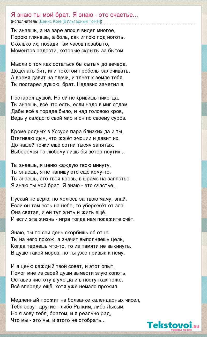 Ты знаешь, а на заре эпох я видел многое, Порою глянешь, а боль, как иглою под ноготь. Сколько их, позади там часов позабыто, Моментов радости, которые скрыты за бытом. Мысли о том как остаться бы сытым до вечера, Доделать бит, или текстом пробелы залечивать. А время давит на плечи, и тянет к земле тебя. Ты постарел душою, брат. Недавно заметил я. Постарел душой. Но ей не кривишь никогда. Ты знаешь, всё что есть, если надо в миг отдам, Дабы всё в поряде было, и над головою кров, Ведь у каждого свой мир и он по своему суров. Кроме родных в Уссуре пара близких да и ты, Втягиваю дым, что жжёт эмоции и давит их. До нашей точки ещё сотни тысяч запятых. Выберемся по-любому лишь бы ветер поутих... Ты знаешь, я ценю каждую твою минуту. Ты знаешь, я не напишу это ещё кому-то. Ты знаешь, это твоя кровь, в шраме на запястье. Я знаю ты мой брат. Я знаю - это счастье... Пускай не верю, но молюсь за твою маму, знай. Если он там есть на небе, то убережёт от зла. Она святая, и ей тут жить и жить ещё. И если эта жизнь - игра тогда нам покажите счёт. Знаю, ты по сей день скорбишь об отце. Ты на него похож, а значит выполняешь цель, Когда теряешь что-то, то из памяти не выкинуть. В душе такой мороз, но ты уже привык к нему. И я ценю каждый твой совет, и этот опыт, Помог мне из своей души вымести злую копоть, Оставив чистоту в уме да и в поступках тоже. Всё впереди ещё, хотя уже немало прожил. Медленный прожиг на болванке календарных чисел, Тебя зовут другие - либо Рыжим, либо Лысым, Но я зову тебя, братом, и я реально рад, Что мы - это мы, и этого не отобрать...