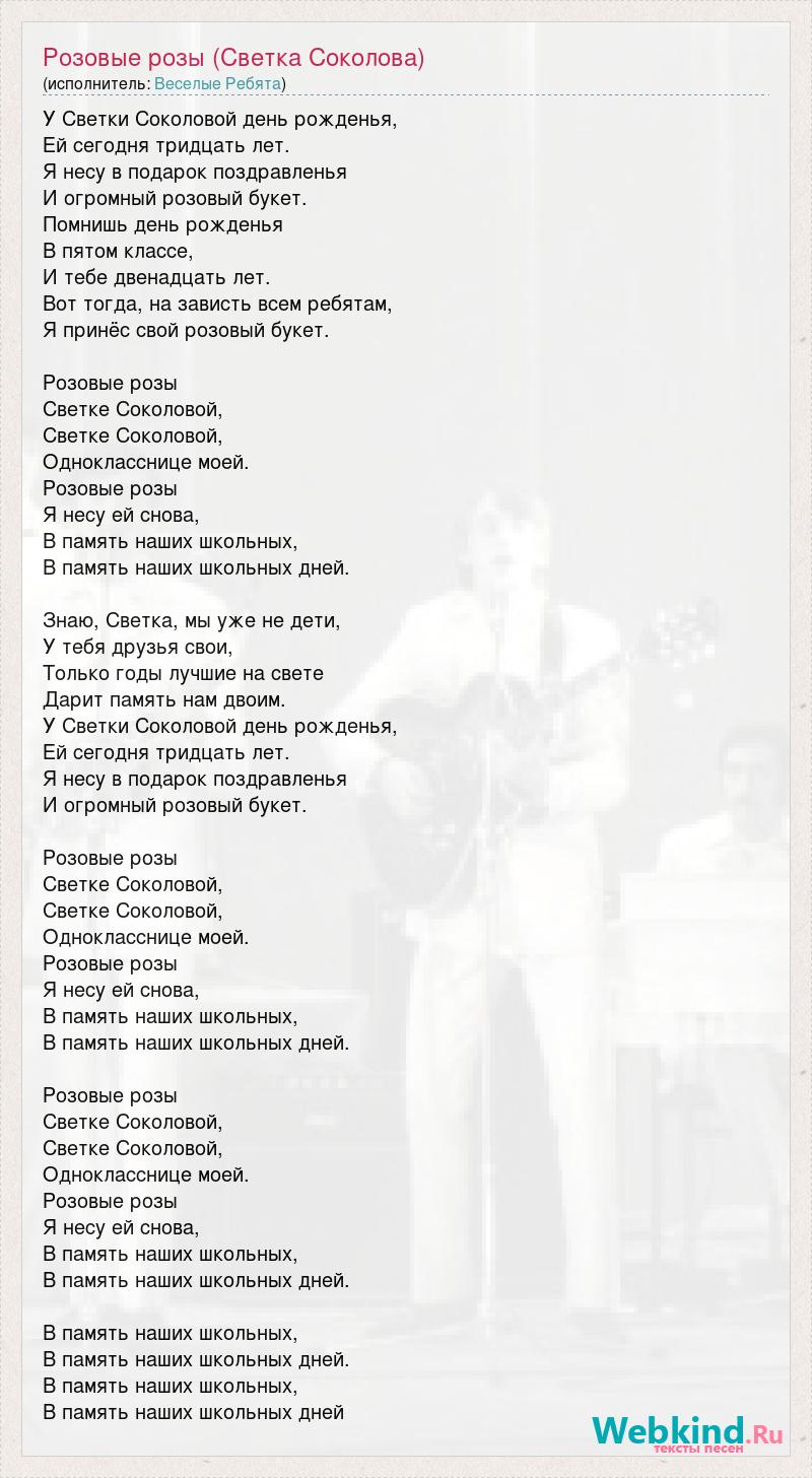 У Светки Соколовой день рожденья, Ей сегодня тридцать лет. Я несу в подарок поздравленья И огромный розовый букет. Помнишь день рожденья В пятом классе, И тебе двенадцать лет. Вот тогда, на зависть всем ребятам, Я принёс свой розовый букет. Розовые розы Светке Соколовой, Светке Соколовой, Однокласснице моей. Розовые розы Я несу ей снова, В память наших школьных, В память наших школьных дней. Знаю, Светка, мы уже не дети, У тебя друзья свои, Только годы лучшие на свете Дарит память нам двоим. У Светки Соколовой день рожденья, Ей сегодня тридцать лет. Я несу в подарок поздравленья И огромный розовый букет. Розовые розы Светке Соколовой, Светке Соколовой, Однокласснице моей. Розовые розы Я несу ей снова, В память наших школьных, В память наших школьных дней. Розовые розы Светке Соколовой, Светке Соколовой, Однокласснице моей. Розовые розы Я несу ей снова, В память наших школьных, В память наших школьных дней. В память наших школьных, В память наших школьных дней. В память наших школьных, В память наших школьных дней