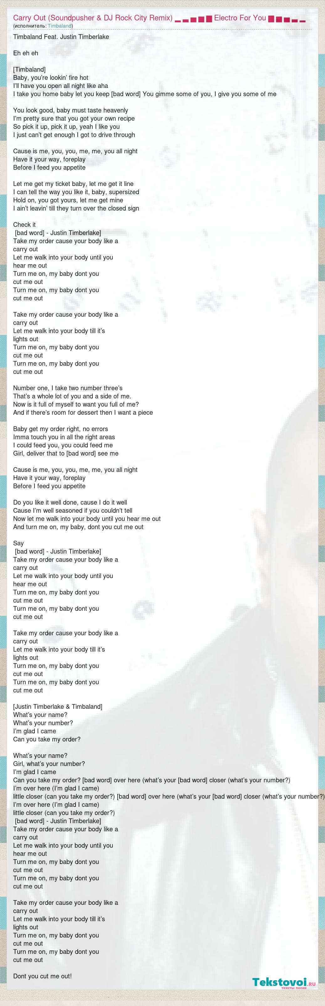 Timbaland Feat. Justin Timberlake Eh eh eh [Timbaland] Baby, you’re lookin’ fire hot I’ll have you open all night like aha I take you home baby let you keep [bad word] You gimme some of you, I give you some of me You look good, baby must taste heavenly I’m pretty sure that you got your own recipe So pick it up, pick it up, yeah I like you I just can’t get enough I got to drive through Cause is me, you, you, me, me, you all night Have it your way, foreplay Before I feed you appetite Let me get my ticket baby, let me get it line I can tell the way you like it, baby, supersized Hold on, you got yours, let me get mine I ain’t leavin’ till they turn over the closed sign Check it [bad word] - Justin Timberlake] Take my order cause your body like a carry out Let me walk into your body until you hear me out Turn me on, my baby dont you cut me out Turn me on, my baby dont you cut me out Take my order cause your body like a carry out Let me walk into your body till it’s lights out Turn me on, my baby dont you cut me out Turn me on, my baby dont you cut me out Number one, I take two number three’s That’s a whole lot of you and a side of me. Now is it full of myself to want you full of me? And if there’s room for dessert then I want a piece Baby get my order right, no errors Imma touch you in all the right areas I could feed you, you could feed me Girl, deliver that to [bad word] see me Cause is me, you, you, me, me, you all night Have it your way, foreplay Before I feed you appetite Do you like it well done, cause I do it well Cause I’m well seasoned if you couldn’t tell Now let me walk into your body until you hear me out And turn me on, my baby, dont you cut me out Say [bad word] - Justin Timberlake] Take my order cause your body like a carry out Let me walk into your body until you hear me out Turn me on, my baby dont you cut me out Turn me on, my baby dont you cut me out Take my order cause your body like a carry out Let me walk into your body till it’s lights out Turn me on, my baby dont you cut me out Turn me on, my baby dont you cut me out [Justin Timberlake & Timbaland] What’s your name? What’s your number? I’m glad I came Can you take my order? What’s your name? Girl, what’s your number? I’m glad I came Can you take my order? [bad word] over here (what’s your [bad word] closer (what’s your number?) I’m over here (I’m glad I came) little closer (can you take my order?) [bad word] over here (what’s your [bad word] closer (what’s your number?) I’m over here (I’m glad I came) little closer (can you take my order?) [bad word] - Justin Timberlake] Take my order cause your body like a carry out Let me walk into your body until you hear me out Turn me on, my baby dont you cut me out Turn me on, my baby dont you cut me out Take my order cause your body like a carry out Let me walk into your body till it’s lights out Turn me on, my baby dont you cut me out Turn me on, my baby dont you cut me out Dont you cut me out!