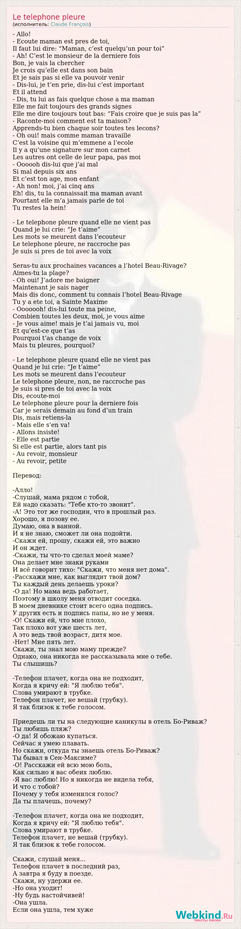 - Allo! - Ecoute maman est pres de toi, Il faut lui dire: “Maman, c’est quelqu’un pour toi” - Ah! C’est le monsieur de la derniere fois Bon, je vais la chercher Je crois qu’elle est dans son bain Et je sais pas si elle va pouvoir venir - Dis-lui, je t’en prie, dis-lui c’est important Et il attend - Dis, tu lui as fais quelque chose a ma maman Elle me fait toujours des grands signes Elle me dire toujours tout bas: “Fais croire que je suis pas la” - Raconte-moi comment est ta maison? Apprends-tu bien chaque soir toutes tes lecons? - Oh oui! mais comme maman travaille C’est la voisine qui m’emmene a l’ecole Il y a qu’une signature sur mon carnet Les autres ont celle de leur papa, pas moi - Oooooh dis-lui que j’ai mal Si mal depuis six ans Et c’est ton age, mon enfant - Ah non! moi, j’ai cinq ans Eh! dis, tu la connaissait ma maman avant Pourtant elle m’a jamais parle de toi Tu restes la hein! - Le telephone pleure quand elle ne vient pas Quand je lui crie: “Je t’aime” Les mots se meurent dans l’ecouteur Le telephone pleure, ne raccroche pas Je suis si pres de toi avec la voix Seras-tu aux prochaines vacances a l’hotel Beau-Rivage? Aimes-tu la plage? - Oh oui! J’adore me baigner Maintenant je sais nager Mais dis donc, comment tu connais l’hotel Beau-Rivage Tu y a ete toi, a Sainte Maxime - Ooooooh! dis-lui toute ma peine, Combien toutes les deux, moi, je vous aime - Je vous aime! mais je t’ai jamais vu, moi Et qu’est-ce que t’as Pourquoi t’as change de voix Mais tu pleures, pourquoi? - Le telephone pleure quand elle ne vient pas Quand je lui crie: “Je t’aime” Les mots se meurent dans l’ecouteur Le telephone pleure, non, ne raccroche pas Je suis si pres de toi avec la voix Dis, ecoute-moi Le telephone pleure pour la derniere fois Car je serais demain au fond d’un train Dis, mais retiens-la - Mais elle s’en va! - Allons insiste! - Elle est partie Si elle est partie, alors tant pis - Au revoir, monsieur - Au revoir, petite Перевод: -Алло! -Слушай, мама рядом с тобой, Ей надо сказать: "Тебе кто-то звонит". -А! Это тот же господин, что в прошлый раз. Хорошо, я позову ее. Думаю, она в ванной. И я не знаю, сможет ли она подойти. -Скажи ей, прошу, скажи ей, это важно И он ждет. -Скажи, ты что-то сделал моей маме? Она делает мне знаки руками И всё говорит тихо: "Скажи, что меня нет дома". -Расскажи мне, как выглядит твой дом? Ты каждый день делаешь уроки? -О да! Но мама ведь работает, Поэтому в школу меня отводит соседка. В моем дневнике стоит всего одна подпись. У других есть и подпись папы, но не у меня. -О! Скажи ей, что мне плохо, Так плохо вот уже шесть лет, А это ведь твой возраст, дитя мое. -Нет! Мне пять лет. Скажи, ты знал мою маму прежде? Однако, она никогда не рассказывала мне о тебе. Ты слышишь? -Телефон плачет, когда она не подходит, Когда я кричу ей: "Я люблю тебя". Слова умирают в трубке. Телефон плачет, не вешай (трубку). Я так близок к тебе голосом. Приедешь ли ты на следующие каникулы в отель Бо-Риваж? Ты любишь пляж? -О да! Я обожаю купаться. Сейчас я умею плавать. Но скажи, откуда ты знаешь отель Бо-Риваж? Ты бывал в Сен-Максиме? -О! Расскажи ей всю мою боль, Как сильно я вас обеих люблю. -Я вас люблю! Но я никогда не видела тебя, И что с тобой? Почему у тебя изменился голос? Да ты плачешь, почему? -Телефон плачет, когда она не подходит, Когда я кричу ей: "Я люблю тебя". Слова умирают в трубке. Телефон плачет, не вешай (трубку). Я так близок к тебе голосом. Скажи, слушай меня... Телефон плачет в последний раз, А завтра я буду в поезде. Скажи, ну удержи ее. -Но она уходит! -Ну будь настойчивей! -Она ушла. Если она ушла, тем хуже