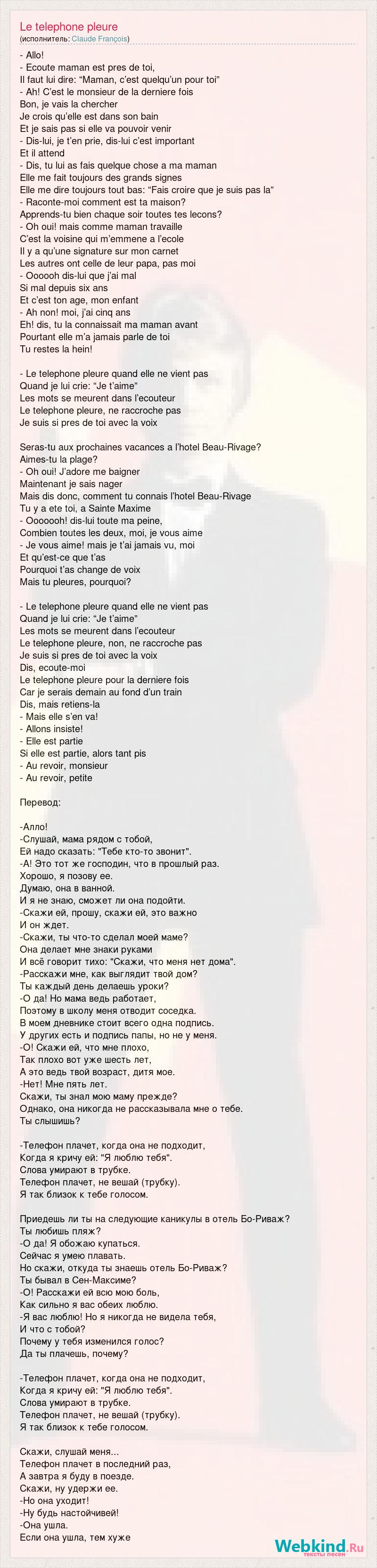 - Allo! - Ecoute maman est pres de toi, Il faut lui dire: “Maman, c’est quelqu’un pour toi” - Ah! C’est le monsieur de la derniere fois Bon, je vais la chercher Je crois qu’elle est dans son bain Et je sais pas si elle va pouvoir venir - Dis-lui, je t’en prie, dis-lui c’est important Et il attend - Dis, tu lui as fais quelque chose a ma maman Elle me fait toujours des grands signes Elle me dire toujours tout bas: “Fais croire que je suis pas la” - Raconte-moi comment est ta maison? Apprends-tu bien chaque soir toutes tes lecons? - Oh oui! mais comme maman travaille C’est la voisine qui m’emmene a l’ecole Il y a qu’une signature sur mon carnet Les autres ont celle de leur papa, pas moi - Oooooh dis-lui que j’ai mal Si mal depuis six ans Et c’est ton age, mon enfant - Ah non! moi, j’ai cinq ans Eh! dis, tu la connaissait ma maman avant Pourtant elle m’a jamais parle de toi Tu restes la hein! - Le telephone pleure quand elle ne vient pas Quand je lui crie: “Je t’aime” Les mots se meurent dans l’ecouteur Le telephone pleure, ne raccroche pas Je suis si pres de toi avec la voix Seras-tu aux prochaines vacances a l’hotel Beau-Rivage? Aimes-tu la plage? - Oh oui! J’adore me baigner Maintenant je sais nager Mais dis donc, comment tu connais l’hotel Beau-Rivage Tu y a ete toi, a Sainte Maxime - Ooooooh! dis-lui toute ma peine, Combien toutes les deux, moi, je vous aime - Je vous aime! mais je t’ai jamais vu, moi Et qu’est-ce que t’as Pourquoi t’as change de voix Mais tu pleures, pourquoi? - Le telephone pleure quand elle ne vient pas Quand je lui crie: “Je t’aime” Les mots se meurent dans l’ecouteur Le telephone pleure, non, ne raccroche pas Je suis si pres de toi avec la voix Dis, ecoute-moi Le telephone pleure pour la derniere fois Car je serais demain au fond d’un train Dis, mais retiens-la - Mais elle s’en va! - Allons insiste! - Elle est partie Si elle est partie, alors tant pis - Au revoir, monsieur - Au revoir, petite Перевод: -Алло! -Слушай, мама рядом с тобой, Ей надо сказать: "Тебе кто-то звонит". -А! Это тот же господин, что в прошлый раз. Хорошо, я позову ее. Думаю, она в ванной. И я не знаю, сможет ли она подойти. -Скажи ей, прошу, скажи ей, это важно И он ждет. -Скажи, ты что-то сделал моей маме? Она делает мне знаки руками И всё говорит тихо: "Скажи, что меня нет дома". -Расскажи мне, как выглядит твой дом? Ты каждый день делаешь уроки? -О да! Но мама ведь работает, Поэтому в школу меня отводит соседка. В моем дневнике стоит всего одна подпись. У других есть и подпись папы, но не у меня. -О! Скажи ей, что мне плохо, Так плохо вот уже шесть лет, А это ведь твой возраст, дитя мое. -Нет! Мне пять лет. Скажи, ты знал мою маму прежде? Однако, она никогда не рассказывала мне о тебе. Ты слышишь? -Телефон плачет, когда она не подходит, Когда я кричу ей: "Я люблю тебя". Слова умирают в трубке. Телефон плачет, не вешай (трубку). Я так близок к тебе голосом. Приедешь ли ты на следующие каникулы в отель Бо-Риваж? Ты любишь пляж? -О да! Я обожаю купаться. Сейчас я умею плавать. Но скажи, откуда ты знаешь отель Бо-Риваж? Ты бывал в Сен-Максиме? -О! Расскажи ей всю мою боль, Как сильно я вас обеих люблю. -Я вас люблю! Но я никогда не видела тебя, И что с тобой? Почему у тебя изменился голос? Да ты плачешь, почему? -Телефон плачет, когда она не подходит, Когда я кричу ей: "Я люблю тебя". Слова умирают в трубке. Телефон плачет, не вешай (трубку). Я так близок к тебе голосом. Скажи, слушай меня... Телефон плачет в последний раз, А завтра я буду в поезде. Скажи, ну удержи ее. -Но она уходит! -Ну будь настойчивей! -Она ушла. Если она ушла, тем хуже