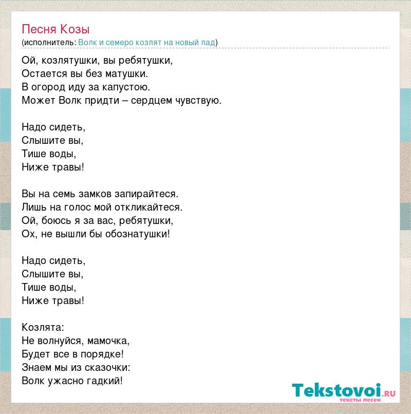 Ой, козлятушки, вы ребятушки, Остается вы без матушки. В огород иду за капустою. Может Волк придти – сердцем чувствую. Надо сидеть, Слышите вы, Тише воды, Ниже травы! Вы на семь замков запирайтеся. Лишь на голос мой откликайтеся. Ой, боюсь я за вас, ребятушки, Ох, не вышли бы обознатушки! Надо сидеть, Слышите вы, Тише воды, Ниже травы! Козлята: Не волнуйся, мамочка, Будет все в порядке! Знаем мы из сказочки: Волк ужасно гадкий!