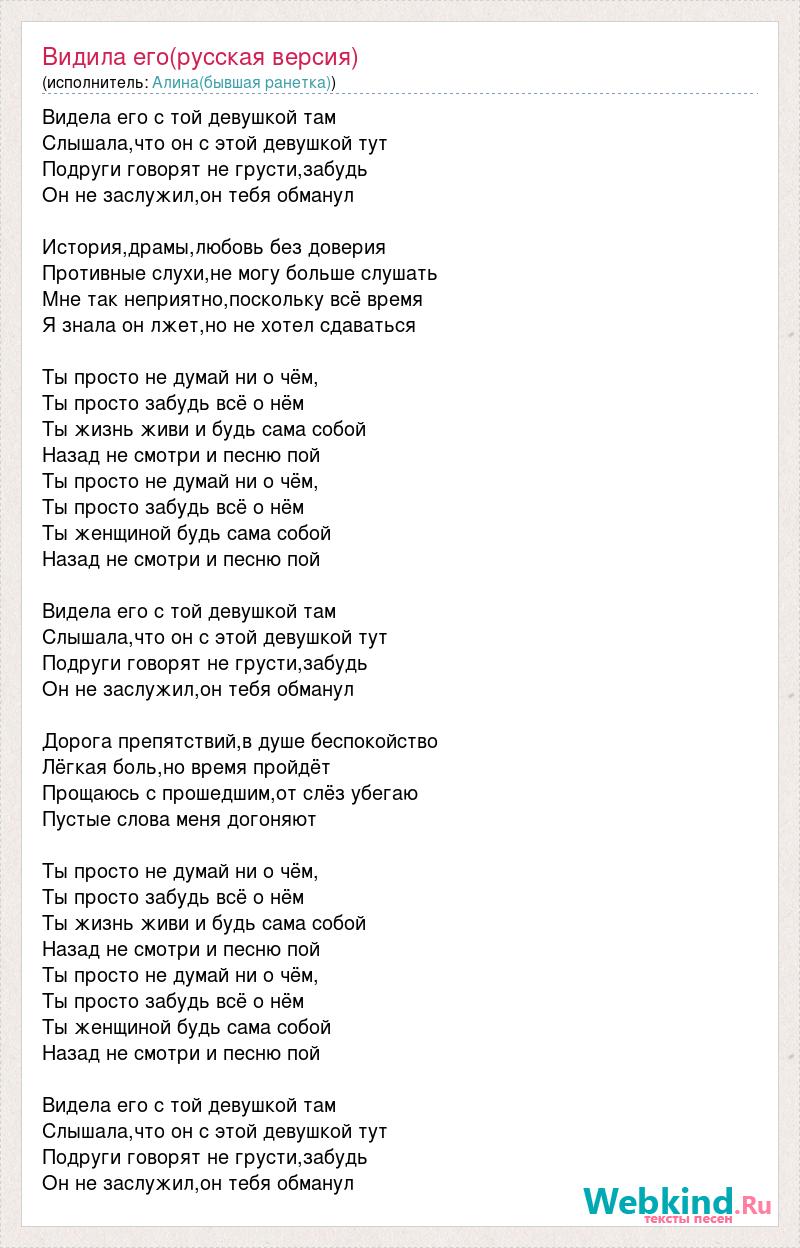 Видела его с той девушкой там Слышала,что он с этой девушкой тут Подруги говорят не грусти,забудь Он не заслужил,он тебя обманул История,драмы,любовь без доверия Противные слухи,не могу больше слушать Мне так неприятно,поскольку всё время Я знала он лжет,но не хотел сдаваться Ты просто не думай ни о чём, Ты просто забудь всё о нём Ты жизнь живи и будь сама собой Назад не смотри и песню пой Ты просто не думай ни о чём, Ты просто забудь всё о нём Ты женщиной будь сама собой Назад не смотри и песню пой Видела его с той девушкой там Слышала,что он с этой девушкой тут Подруги говорят не грусти,забудь Он не заслужил,он тебя обманул Дорога препятствий,в душе беспокойство Лёгкая боль,но время пройдёт Прощаюсь с прошедшим,от слёз убегаю Пустые слова меня догоняют Ты просто не думай ни о чём, Ты просто забудь всё о нём Ты жизнь живи и будь сама собой Назад не смотри и песню пой Ты просто не думай ни о чём, Ты просто забудь всё о нём Ты женщиной будь сама собой Назад не смотри и песню пой Видела его с той девушкой там Слышала,что он с этой девушкой тут Подруги говорят не грусти,забудь Он не заслужил,он тебя обманул