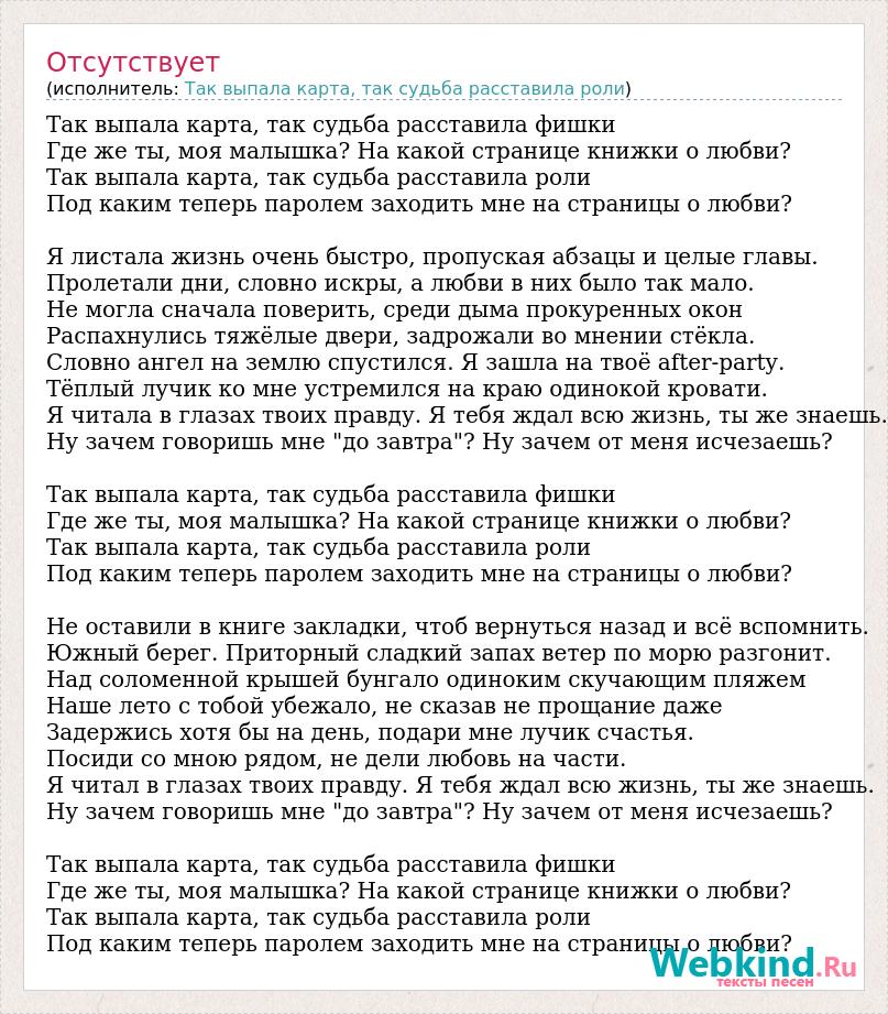 Так выпала карта, так судьба расставила фишки Где же ты, моя малышка? На какой странице книжки о любви? Так выпала карта, так судьба расставила роли Под каким теперь паролем заходить мне на страницы о любви? Я листала жизнь очень быстро, пропуская абзацы и целые главы. Пролетали дни, словно искры, а любви в них было так мало. Не могла сначала поверить, среди дыма прокуренных окон Распахнулись тяжёлые двери, задрожали во мнении стёкла. Словно ангел на землю спустился. Я зашла на твоё after-party. Тёплый лучик ко мне устремился на краю одинокой кровати. Я читала в глазах твоих правду. Я тебя ждал всю жизнь, ты же знаешь. Ну зачем говоришь мне "до завтра"? Ну зачем от меня исчезаешь? Так выпала карта, так судьба расставила фишки Где же ты, моя малышка? На какой странице книжки о любви? Так выпала карта, так судьба расставила роли Под каким теперь паролем заходить мне на страницы о любви? Не оставили в книге закладки, чтоб вернуться назад и всё вспомнить. Южный берег. Приторный сладкий запах ветер по морю разгонит. Над соломенной крышей бунгало одиноким скучающим пляжем Наше лето с тобой убежало, не сказав не прощание даже Задержись хотя бы на день, подари мне лучик счастья. Посиди со мною рядом, не дели любовь на части. Я читал в глазах твоих правду. Я тебя ждал всю жизнь, ты же знаешь. Ну зачем говоришь мне "до завтра"? Ну зачем от меня исчезаешь? Так выпала карта, так судьба расставила фишки Где же ты, моя малышка? На какой странице книжки о любви? Так выпала карта, так судьба расставила роли Под каким теперь паролем заходить мне на страницы о любви?