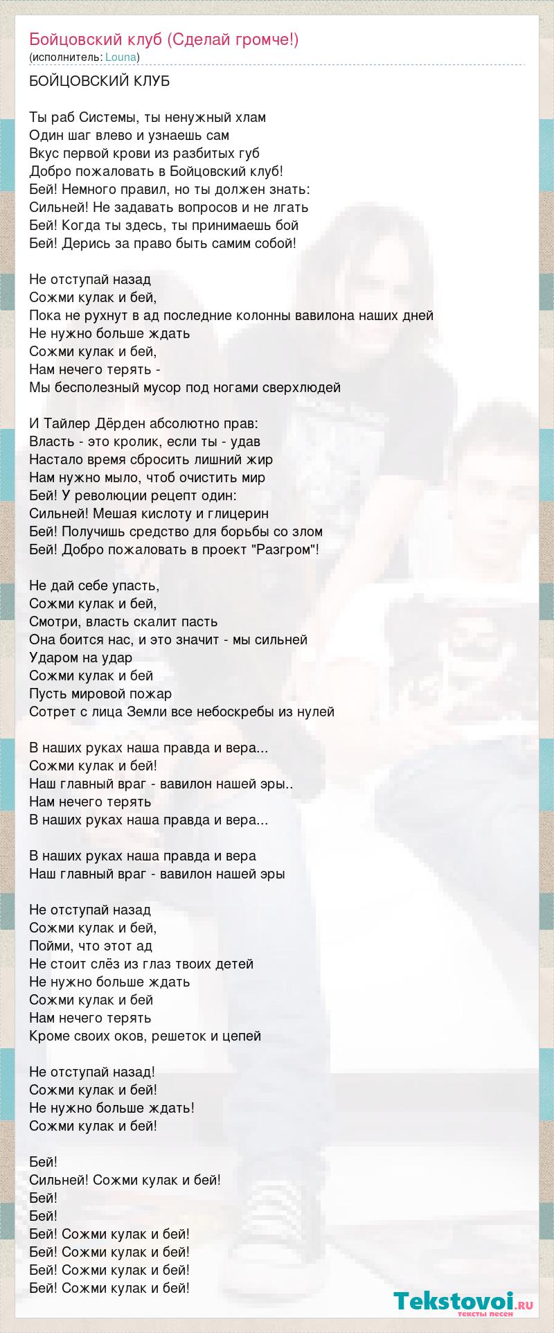 БОЙЦОВСКИЙ КЛУБ Ты раб Системы, ты ненужный хлам Один шаг влево и узнаешь сам Вкус первой крови из разбитых губ Добро пожаловать в Бойцовский клуб! Бей! Немного правил, но ты должен знать: Сильней! Не задавать вопросов и не лгать Бей! Когда ты здесь, ты принимаешь бой Бей! Дерись за право быть самим собой! Не отступай назад Сожми кулак и бей, Пока не рухнут в ад последние колонны вавилона наших дней Не нужно больше ждать Сожми кулак и бей, Нам нечего терять - Мы бесполезный мусор под ногами сверхлюдей И Тайлер Дёрден абсолютно прав: Власть - это кролик, если ты - удав Настало время сбросить лишний жир Нам нужно мыло, чтоб очистить мир Бей! У революции рецепт один: Сильней! Мешая кислоту и глицерин Бей! Получишь средство для борьбы со злом Бей! Добро пожаловать в проект "Разгром"! Не дай себе упасть, Сожми кулак и бей, Смотри, власть скалит пасть Она боится нас, и это значит - мы сильней Ударом на удар Сожми кулак и бей Пусть мировой пожар Сотрет с лица Земли все небоскребы из нулей В наших руках наша правда и вера... Сожми кулак и бей! Наш главный враг - вавилон нашей эры.. Нам нечего терять В наших руках наша правда и вера... В наших руках наша правда и вера Наш главный враг - вавилон нашей эры Не отступай назад Сожми кулак и бей, Пойми, что этот ад Не стоит слёз из глаз твоих детей Не нужно больше ждать Сожми кулак и бей Нам нечего терять Кроме своих оков, решеток и цепей Не отступай назад! Сожми кулак и бей! Не нужно больше ждать! Сожми кулак и бей! Бей! Сильней! Сожми кулак и бей! Бей! Бей! Бей! Сожми кулак и бей! Бей! Сожми кулак и бей! Бей! Сожми кулак и бей! Бей! Сожми кулак и бей!