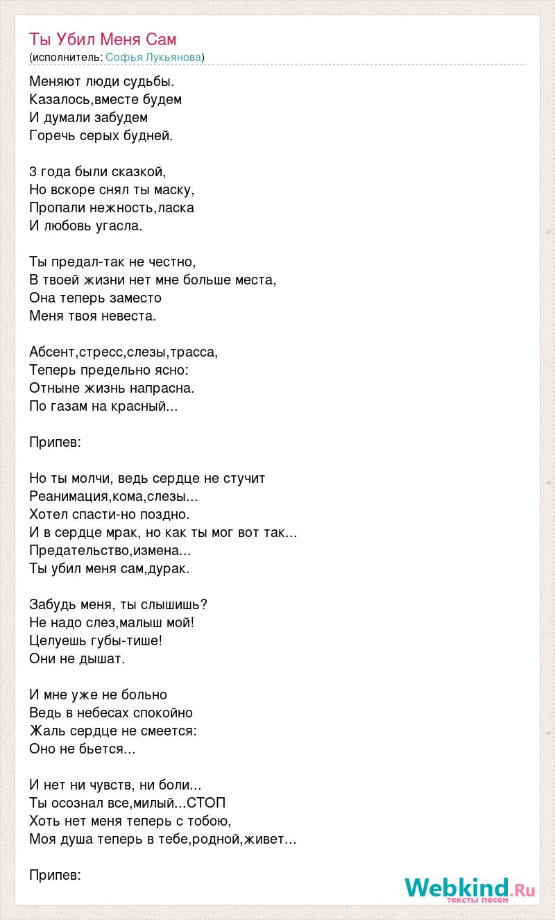Меняют люди судьбы. Казалось,вместе будем И думали забудем Горечь серых будней. 3 года были сказкой, Но вскоре снял ты маску, Пропали нежность,ласка И любовь угасла. Ты предал-так не честно, В твоей жизни нет мне больше места, Она теперь заместо Меня твоя невеста. Абсент,стресс,слезы,трасса, Теперь предельно ясно: Отныне жизнь напрасна. По газам на красный... Припев: Но ты молчи, ведь сердце не стучит Реанимация,кома,слезы... Хотел спасти-но поздно. И в сердце мрак, но как ты мог вот так... Предательство,измена... Ты убил меня сам,дурак. Забудь меня, ты слышишь? Не надо слез,малыш мой! Целуешь губы-тише! Они не дышат. И мне уже не больно Ведь в небесах спокойно Жаль сердце не смеется: Оно не бьется... И нет ни чувств, ни боли... Ты осознал все,милый...СТОП Хоть нет меня теперь с тобою, Моя душа теперь в тебе,родной,живет... Припев: