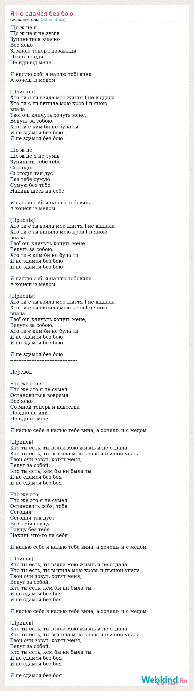 Що ж це я Що ж це я не зумів Зупинитися вчасно Все ясно Зі мною тепер і назавжди Пізно не йди Не йди від мене Я наллю собі я наллю тобі вина А хочеш із медом [Приспів] Хто ти є ти взяла моє життя І не віддала Хто ти є ти випила мою кров І п’яною впала Твої очі кличуть хочуть мене, Ведуть за собою. Хто ти є ким би не була ти Я не здамся без бою Я не здамся без бою Шо ж це Шо ж це я не зумів Зупинити себе тебе Сьогодні Сьогодні так дує Без тебе сумую Сумую без тебе Накинь щось на себе Я наллю собі я наллю тобі вина А хочеш із медом [Приспів] Хто ти є ти взяла моє життя І не віддала Хто ти є ти випила мою кров І п’яною впала Твої очі кличуть хочуть мене Ведуть за собою. Хто ти є ким би не була ти Я не здамся без бою Я не здамся без бою Я наллю собі я наллю тобі вина А хочеш із медом [Приспів] Хто ти є ти взяла моє життя І не віддала Хто ти є ти випила мою кров І п’яною впала Твої очі кличуть хочуть мене, Ведуть за собою. Хто ти є ким би не була ти Я не здамся без бою Я не здамся без бою Я не здамся без бою ----------------------------------------- Перевод Что же это я Что же это я не сумел Остановиться вовремя Все ясно Со мной теперь и навсегда Поздно не иди Не иди от меня Я налью себе я налью тебе вина, а хочешь и с медом [Припев] Кто ты есть, ты взяла мою жизнь и не отдала Кто ты есть, ты выпила мою кровь и пьяной упала Твои очи зовут, хотят меня, Ведут за собой. Кто ты есть, кем бы ни была ты Я не сдамся без боя Я не сдамся без боя Что же это Что же это я не сумел Остановить себя, тебя Сегодня Сегодня так дует Без тебя грущу Грущу без тебя Накинь что-то на себя Я налью себе я налью тебе вина, а хочешь и с медом [Припев] Кто ты есть, ты взяла мою жизнь и не отдала Кто ты есть, ты выпила мою кровь и пьяной упала Твои очи зовут, хотят меня, Ведут за собой. Кто ты есть, кем бы ни была ты Я не сдамся без боя Я не сдамся без боя Я налью себе я налью тебе вина, а хочешь и с медом [Припев] Кто ты есть, ты взяла мою жизнь и не отдала Кто ты есть, ты выпила мою кровь и пьяной упала Твои очи зовут, хотят меня, Ведут за собой. Кто ты есть, кем бы ни была ты Я не сдамся без боя Я не сдамся без боя Я не сдамся без боя