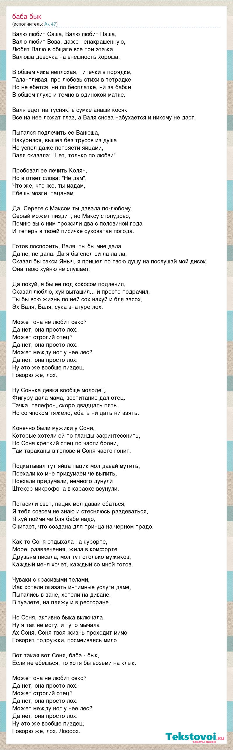 Валю любит Саша, Валю любит Паша, Валю любит Вова, даже ненакрашенную, Любят Валю в общаге все три этажа, Валюша девочка на внешность хороша. В общем чика неплохая, титечки в порядке, Талантливая, про любовь стихи в тетрадке Но не ебется, ни по бесплатке, ни за бабки В общем глухо и темно в одинокой матке. Валя едет на тусняк, в сумке анаши косяк Все на нее ложат глаз, а Валя снова набухается и никому не даст. Пытался подлечить ее Ванюша, Накурился, вышел без трусов из душа Не успел даже потрясти яйцами, Валя сказала: "Нет, только по любви" Пробовал ее лечить Колян, Но в ответ слова: "Не дам", Что же, что же, ты мадам, Ебешь мозги, пацанам Да. Сереге с Максом ты давала по-любому, Серый может пиздит, но Максу стопудово, Помню вы с ним прожили два с половиной года И теперь в твоей писичке суховатая погода. Готов поспорить, Валя, ты бы мне дала Да не, не дала. Да я бы спел ей ла ла ла, Сказал бы сэкси Ямыч, я пришел по твою душу на послушай мой дисок, Она твою хуйню не слушает. Да похуй, я бы ее под кокосом подлечил, Сказал люблю, хуй вытащил... и просто подрачил, Ты бы всю жизнь по ней сох нахуй и бля засох, Эх Валя, Валя, сука внатуре лох. Может она не любит секс? Да нет, она просто лох. Может строгий отец? Да нет, она просто лох. Может между ног у нее лес? Да нет, она просто лох. Ну это же вообще пиздец, Говорю же, лох. Ну Сонька девка вообще молодец, Фигуру дала мама, воспитание дал отец. Тачка, телефон, скоро двадцать пять. Но со чпоком тяжело, ебать ни дать ни взять. Конечно были мужики у Сони, Которые хотели ей по гланды зафинтесонить, Но Соня крепкий спец по части брони, Там тараканы в голове и Соня часто гонит. Подкатывал тут яйца пацик мол давай мутить, Поехали ко мне придумаем че выпить, Поехали придумали, немного дунули Штекер микрофона в караоке всунули. Погасили свет, пацик мол давай ебаться, Я тебя совсем не знаю и стесняюсь раздеваться, Я хуй пойми че бля бабе надо, Считает, что создана для принца на черном прадо. Как-то Соня отдыхала на курорте, Море, развлечения, жила в комфорте Друзьям писала, мол тут столько мужиков, Каждый меня хочет, каждый со мной готов. Чуваки с красивыми телами, Иак хотели оказать интимные услуги даме, Пытались в ване, хотели на диване, В туалете, на пляжу и в ресторане. Но Соня, активно быка включала Ну я так не могу, и тупо мычала Ах Соня, Соня твоя жизнь проходит мимо Говорят подружки, посмеиваясь мило Вот такая вот Соня, баба - бык, Если не ебешься, то хотя бы возьми на клык. Может она не любит секс? Да нет, она просто лох. Может строгий отец? Да нет, она просто лох. Может между ног у нее лес? Да нет, она просто лох. Ну это же вообще пиздец, Говорю же, лох. Лоооох.