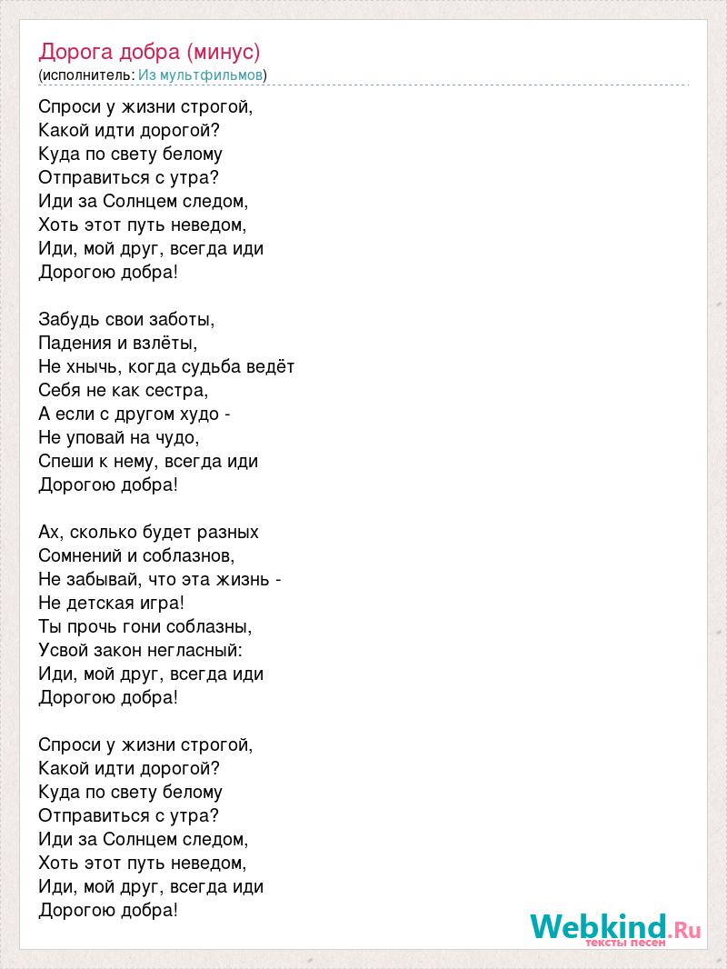 Спроси у жизни строгой, Какой идти дорогой? Куда по свету белому Отправиться с утра? Иди за Солнцем следом, Хоть этот путь неведом, Иди, мой друг, всегда иди Дорогою добра! Забудь свои заботы, Падения и взлёты, Не хнычь, когда судьба ведёт Себя не как сестра, А если с другом худо - Не уповай на чудо, Спеши к нему, всегда иди Дорогою добра! Ах, сколько будет разных Сомнений и соблазнов, Не забывай, что эта жизнь - Не детская игра! Ты прочь гони соблазны, Усвой закон негласный: Иди, мой друг, всегда иди Дорогою добра! Спроси у жизни строгой, Какой идти дорогой? Куда по свету белому Отправиться с утра? Иди за Солнцем следом, Хоть этот путь неведом, Иди, мой друг, всегда иди Дорогою добра!
