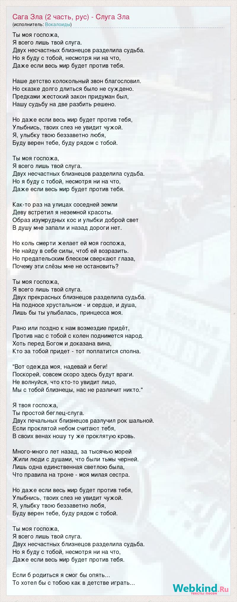 Ты моя госпожа, Я всего лишь твой слуга. Двух несчастных близнецов разделила судьба. Но я буду с тобой, несмотря ни на что, Даже если весь мир будет против тебя. Наше детство колокольный звон благословил. Но сказке долго длиться было не суждено. Предками жестокий закон придуман был, Нашу судьбу на две разбить решено. Но даже если весь мир будет против тебя, Улыбнись, твоих слез не увидит чужой. Я, улыбку твою беззаветно любя, Буду верен тебе, буду рядом с тобой. Ты моя госпожа, Я всего лишь твой слуга. Двух несчастных близнецов разделила судьба. Но я буду с тобой, несмотря ни на что, Даже если весь мир будет против тебя. Как-то раз на улицах соседней земли Деву встретил я неземной красоты. Образ изумрудных кос и улыбки доброй свет В душу мне запали и назад дороги нет. Но коль смерти желает ей моя госпожа, Не найду в себе силы, чтоб ей возразить. Но предательским блеском сверкают глаза, Почему эти слёзы мне не остановить? Ты моя госпожа, Я всего лишь твой слуга. Двух прекрасных близнецов разделила судьба. На подносе хрустальном - и сердце, и душа, Лишь бы ты улыбалась, принцесса моя. Рано или поздно к нам возмездие придёт, Против нас с тобой с колен поднимется народ. Хоть перед Богом и доказана вина, Кто за тобой придет - тот поплатится сполна. "Вот одежда моя, надевай и беги! Поскорей, совсем скоро здесь будут враги. Не волнуйся, что кто-то увидит лицо, Мы с тобой близнецы, нас не различит никто." Я твоя госпожа, Ты простой беглец-слуга. Двух печальных близнецов разлучил рок шальной. Если проклятой небом считают тебя, В своих венах ношу ту же проклятую кровь. Много-много лет назад, за тысячью морей Жили люди с душами, что были тьмы черней. Лишь одна единственная светлою была, Что правила на троне - моя милая сестра. Но даже если весь мир будет против тебя, Улыбнись, твоих слез не увидит чужой. Я, улыбку твою беззаветно любя, Буду верен тебе, буду рядом с тобой. Ты моя госпожа, Я всего лишь твой слуга. Двух несчастных близнецов разделила судьба. Но я буду с тобой, несмотря ни на что, Даже если весь мир будет против тебя. Если б родиться я смог бы опять... То хотел бы с тобою как в детстве играть...