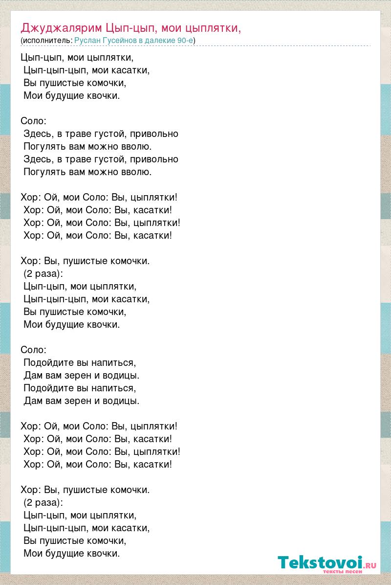 Цып-цып, мои цыплятки, Цып-цып-цып, мои касатки, Вы пушистые комочки, Мои будущие квочки. Соло: Здесь, в траве густой, привольно Погулять вам можно вволю. Здесь, в траве густой, привольно Погулять вам можно вволю. Хор: Ой, мои Соло: Вы, цыплятки! Хор: Ой, мои Соло: Вы, касатки! Хор: Ой, мои Соло: Вы, цыплятки! Хор: Ой, мои Соло: Вы, касатки! Хор: Вы, пушистые комочки. (2 раза): Цып-цып, мои цыплятки, Цып-цып-цып, мои касатки, Вы пушистые комочки, Мои будущие квочки. Соло: Подойдите вы напиться, Дам вам зерен и водицы. Подойдите вы напиться, Дам вам зерен и водицы. Хор: Ой, мои Соло: Вы, цыплятки! Хор: Ой, мои Соло: Вы, касатки! Хор: Ой, мои Соло: Вы, цыплятки! Хор: Ой, мои Соло: Вы, касатки! Хор: Вы, пушистые комочки. (2 раза): Цып-цып, мои цыплятки, Цып-цып-цып, мои касатки, Вы пушистые комочки, Мои будущие квочки.