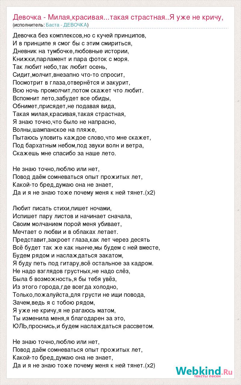 Главная→Исполнители→Баста - ДЕВОЧКА→Девочка - Милая,красивая...такая страстная..Я уже не кричу, я не ругаюсь матом,Т