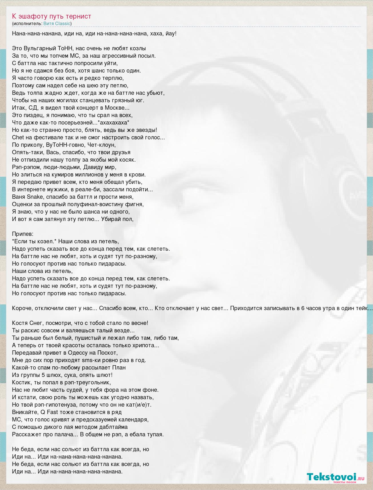 Нана-нана-нанана, иди на, иди на-нана-нана-нана, хаха, йау! Это Вульгарный ТоНН, нас очень не любят козлы За то, что мы топчем МС, за наш агрессивный посыл. С баттла нас тактично попросили уйти, Но я не сдамся без боя, хотя шанс только один. Я часто говорю как есть и редко терплю, Поэтому сам надел себе на шею эту петлю, Ведь толпа жадно ждет, когда же на баттле нас убьют, Чтобы на наших могилах станцевать грязный юг. Итак, СД, я видел твой концерт в Москве... Это пиздец, я понимаю, что ты срал на всех, Что даже как-то посерьезней...*ахахахаха* Но как-то странно просто, блять, ведь вы же звезды! Chet на фестивале так и не смог настроить свой голос... По приколу, ВуТоНН-говно, Чет-клоун, Опять-таки, Вась, спасибо, что твои друзья Не отпиздили нашу толпу за якобы мой косяк. Рэп-рэпом, люди-людьми, Давиду мир, Но злиться на кумиров миллионов у меня в крови. Я передаю привет всем, кто меня обещал убить, В интернете мужики, в реале-би, зассали подойти... Ваня Snake, спасибо за баттл и прости меня, Оценки за прошлый полуфинал-воистину фигня, Я знаю, что у нас не было шанса ни одного, И вот я сам затянул эту петлю... Убирай пол, Припев: *Если ты козел.* Наши слова из петель, Надо успеть сказать все до конца перед тем, как слететь. На баттле нас не любят, хоть и судят тут по-разному, Но голосуют против нас только пидарасы. Наши слова из петель, Надо успеть сказать все до конца перед тем, как слететь. На баттле нас не любят, хоть и судят тут по-разному, Но голосуют против нас только пидарасы. Короче, отключили свет у нас... Спасибо всем, кто... Кто отключает у нас свет... Приходится записывать в 6 часов утра в один тейк... Костя Снег, посмотри, что с тобой стало по весне! Ты раскис совсем и валяешься талый везде... Ты раньше был белый, пушистый и лежал либо там, либо там, А теперь от твоей красоты осталась только хрипота... Передавай привет в Одессу на Поскот, Мне до сих пор приходят sms-ки ровно раз в год. Какой-то спам по-любому рассылает План Из группы 5 шлюх, сука, опять шлют! Костик, ты попал в рэп-треугольник, Нас не любит часть судей, у тебя фора на этом фоне. И кстати, свою роль ты можешь как угодно назвать, Но твой рэп-гипотенуза, потому что он не кат(и/е)т. Вникайте, Q Fast тоже становится в ряд МС, что голос кривят и предсказуемей календаря, С помощью дикого лая методом даблтайма Расскажет про палача... В общем не рэп, а ебала тупая. Не беда, если нас сольют из баттла как всегда, но Иди на... Иди на-нана-нана-нана-нанана. Не беда, если нас сольют из баттла как всегда, но Иди на... Иди на-нана-нана-нана-нанана.